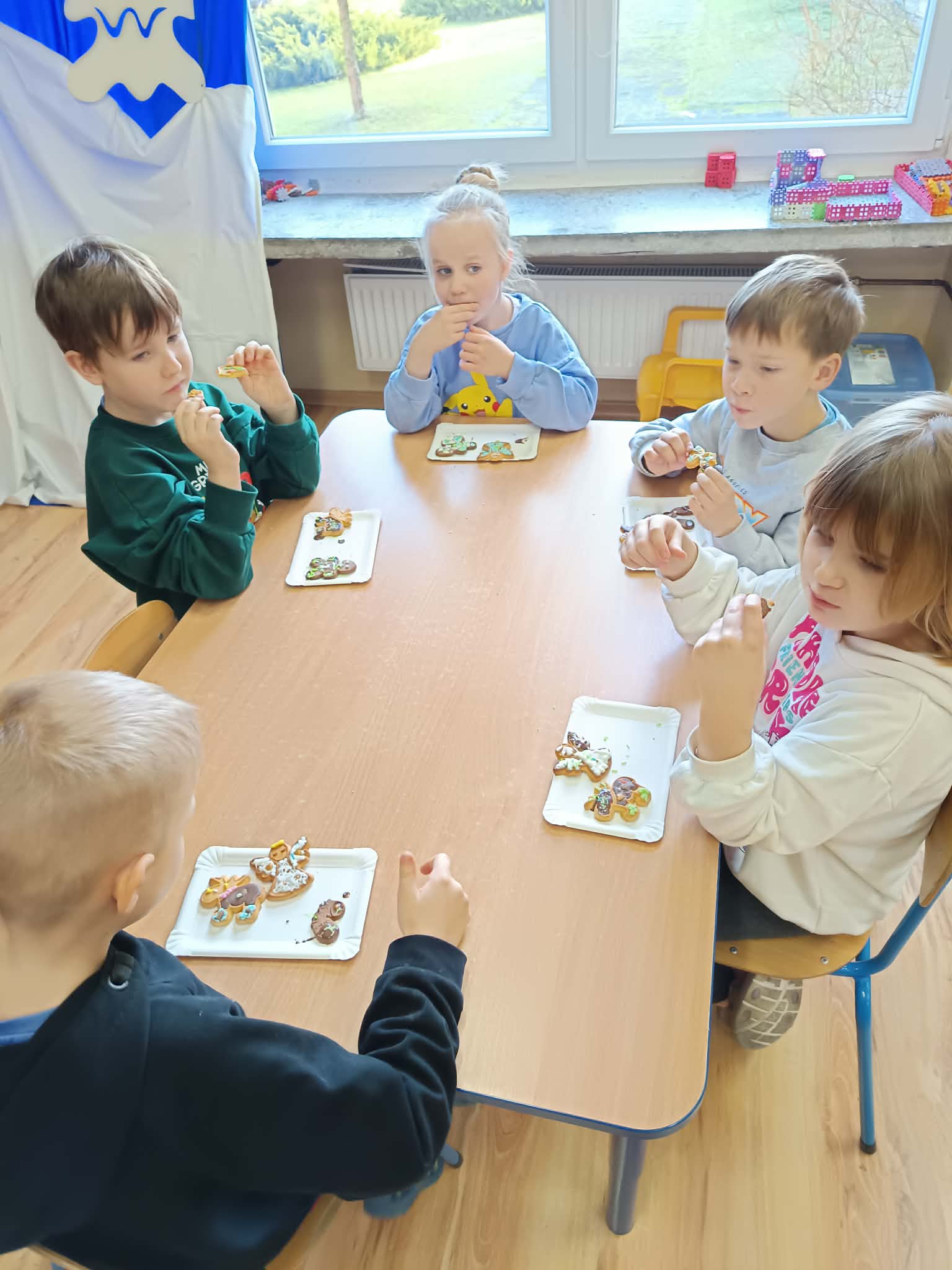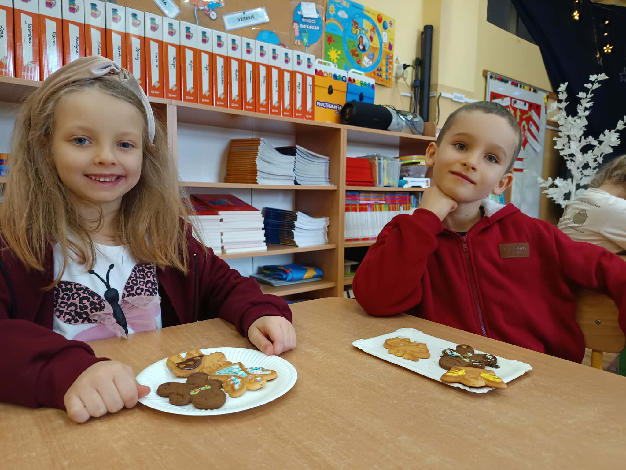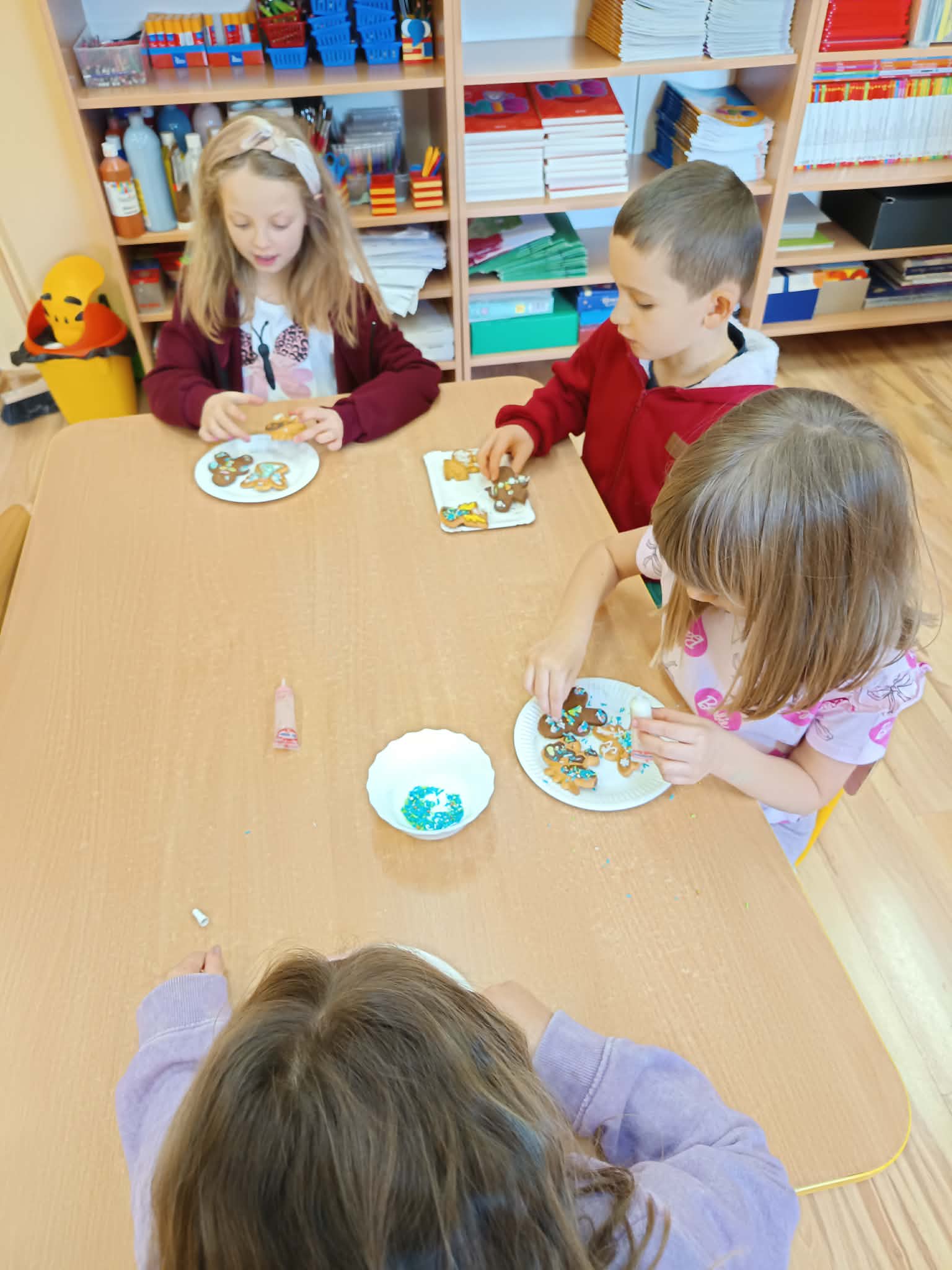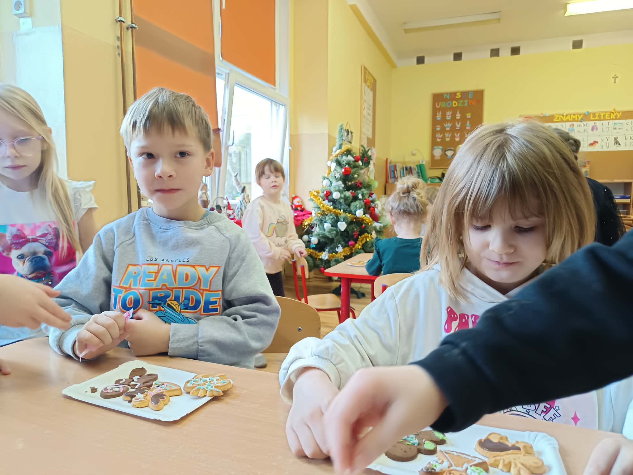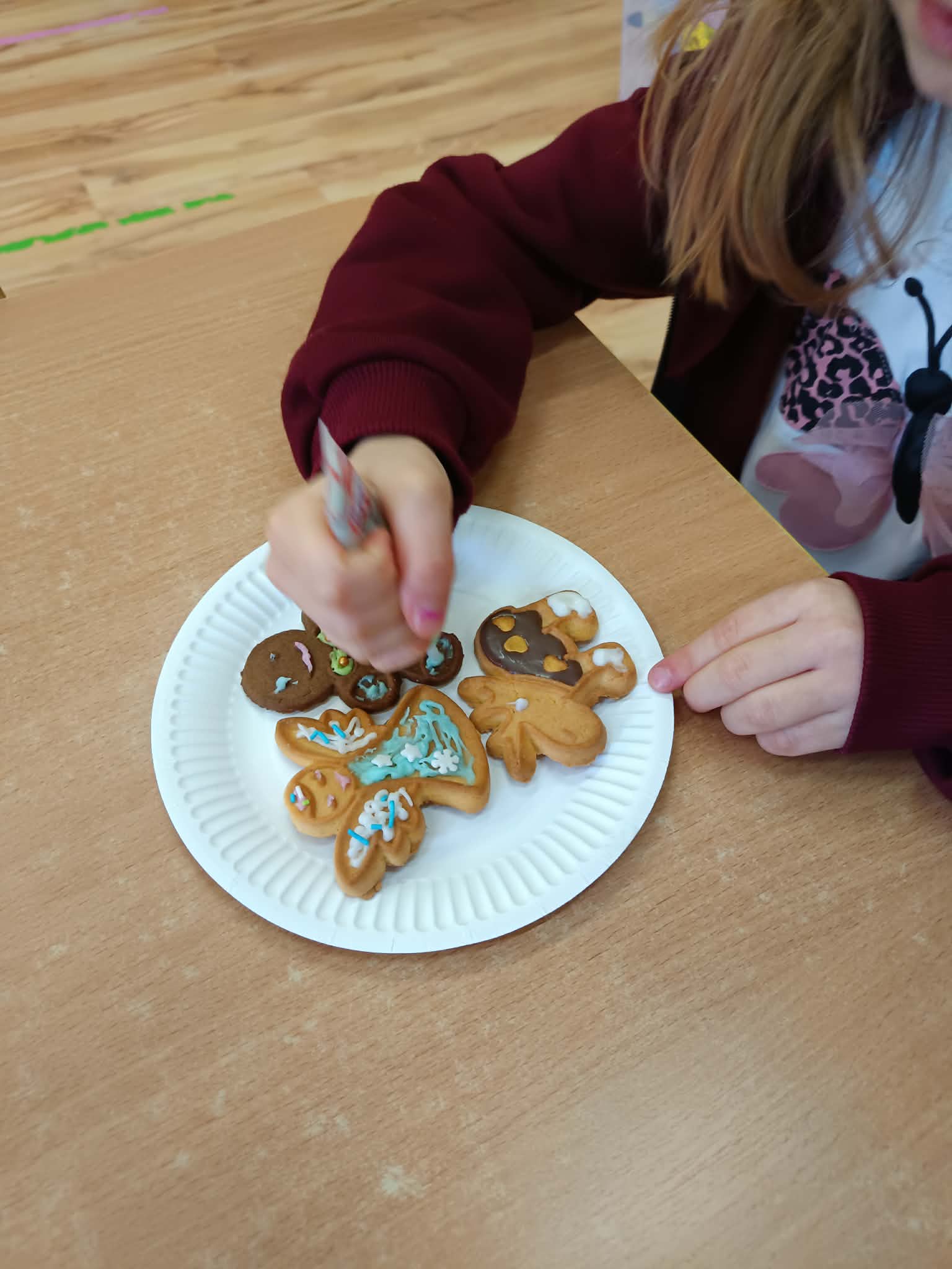 Ozdabianie ciastek to jedna z tradycji Świąt Bożego Narodzenia dlatego w naszym przedszkolu kultywujemy ją również. Dzieci otrzymały kilka upieczonych wcześniej pierniczków w różnych kształtach. Były to renifery, aniołki i ludziki. Dzieci miały możliwość ozdabiać pierniczki polewami, układać cukrowe ozdoby oraz kolorowe posypki. Przedszkolaki ozdabiały pierniki z dużą dokładnością. Te piękne pierniczki jednak długo nie leżały na talerzach, ponieważ w mgnieniu oka wylądowały w brzuchach naszych małych łakomczuchów.
