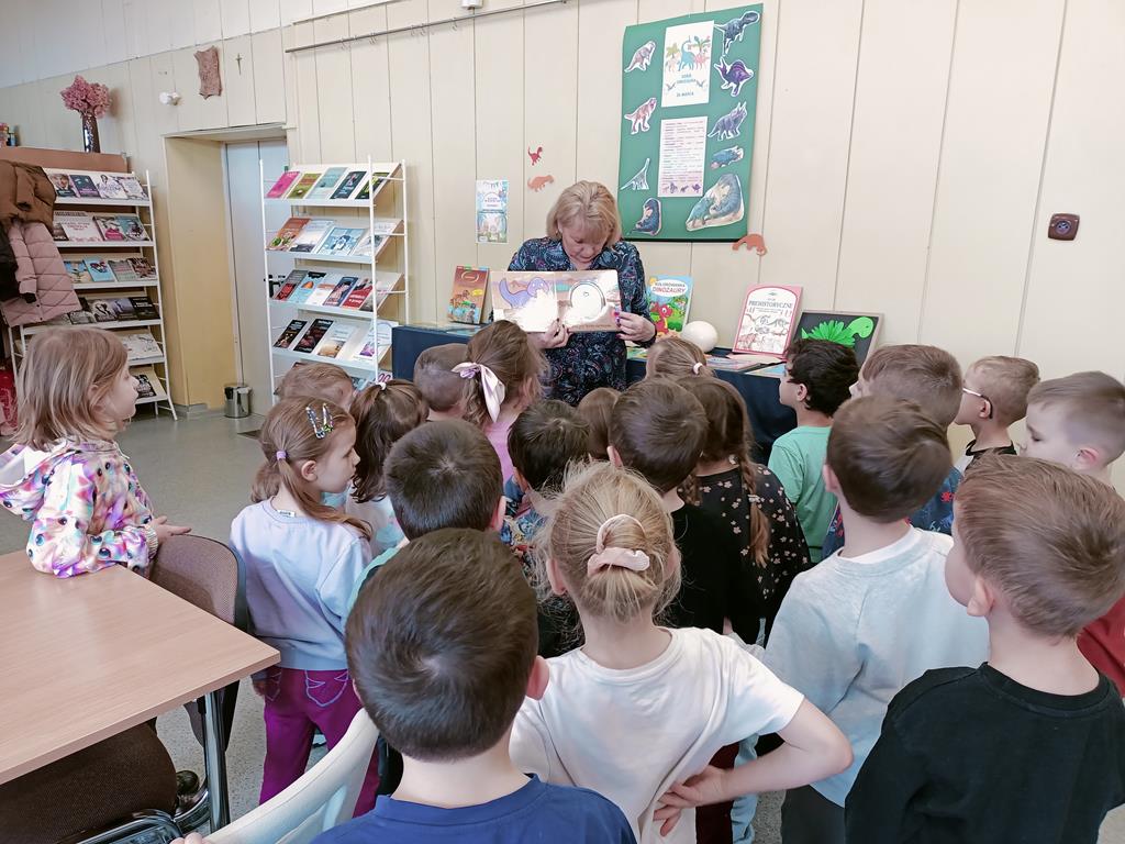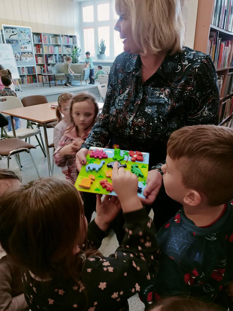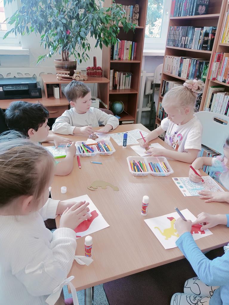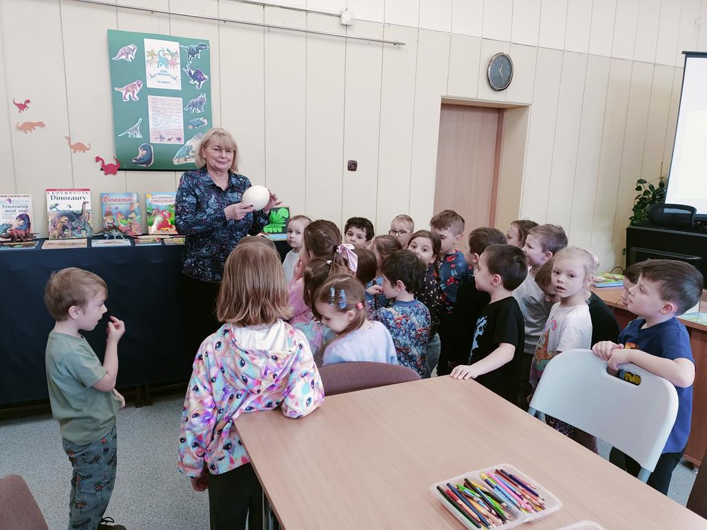 Dzieci odwiedziły dziś bibliotekę pedagogiczną, gdzie uczestniczyły w zajęciach pt. „Tropem dinozaurów”. Podczas spotkania przedszkolaki z dużym zainteresowaniem słuchały ciekawostek o prehistorycznych gadach, oglądały książki i ilustracje przedstawiające różne gatunki dinozaurów oraz brały udział w zabawach tematycznych. Nie zabrakło również wspólnego rozwiązywania zagadek i poszukiwania „śladów” dinozaurów. Zajęcia były nie tylko świetną zabawą, ale także okazją do poszerzenia wiedzy i rozwijania wyobraźni najmłodszych.