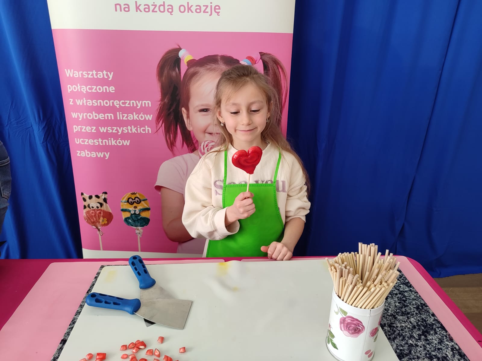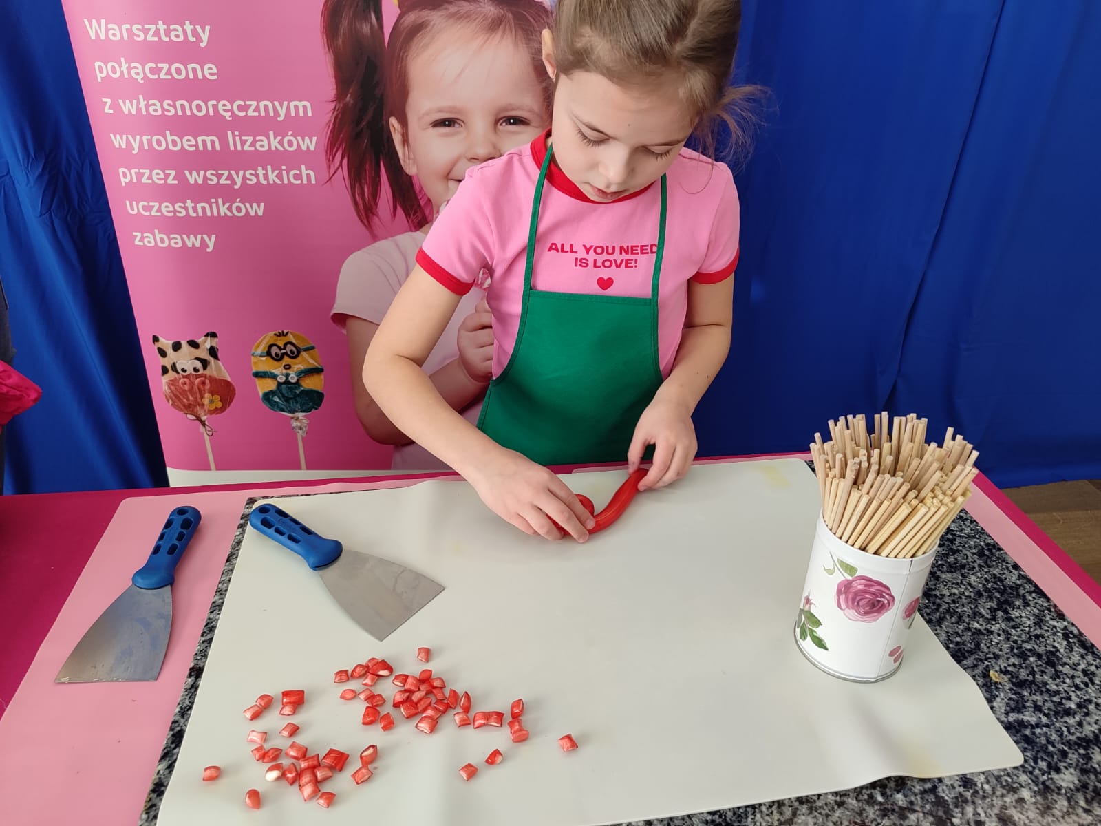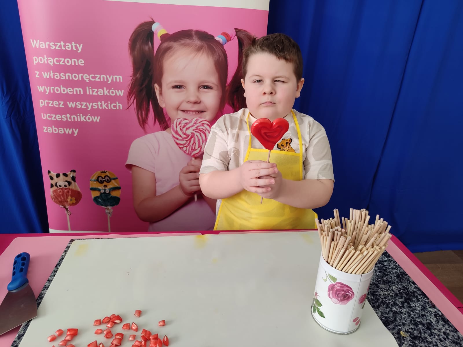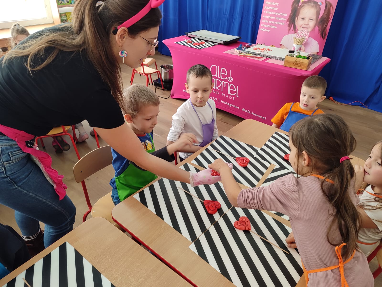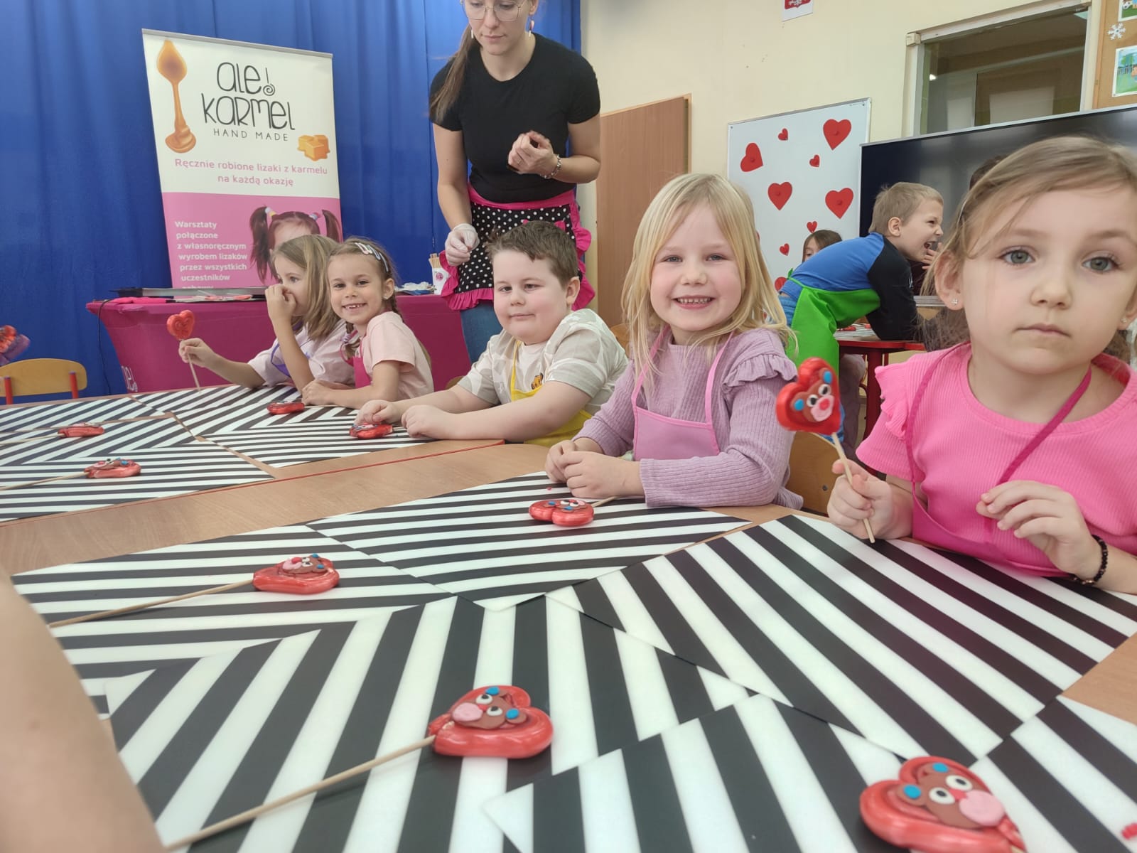 Dzieci miały możliwość wyboru smaku lizaka, który następnie własnoręcznie wykonały. Powstały piękne lizaki w kształcie serduszek o smaku malinowym. . Po zakończeniu pracy starszaki starannie zapakowały swoje wyroby.