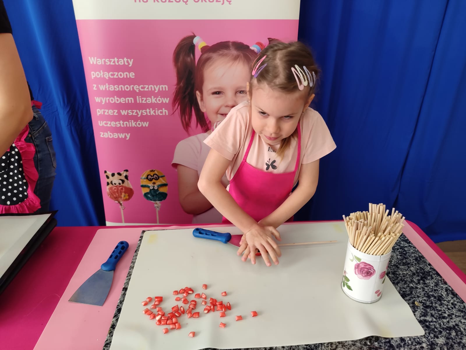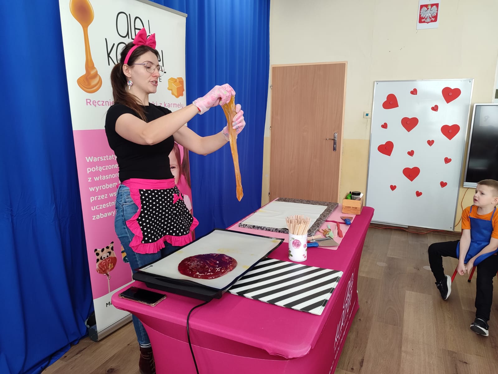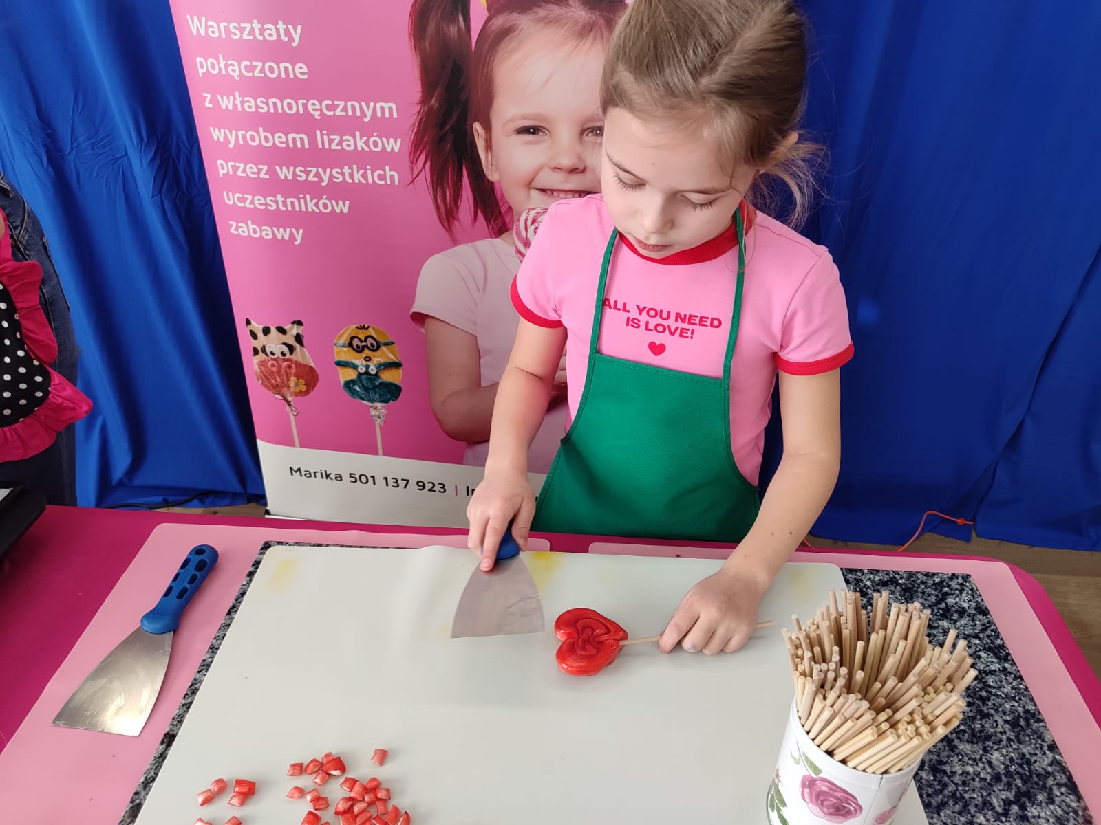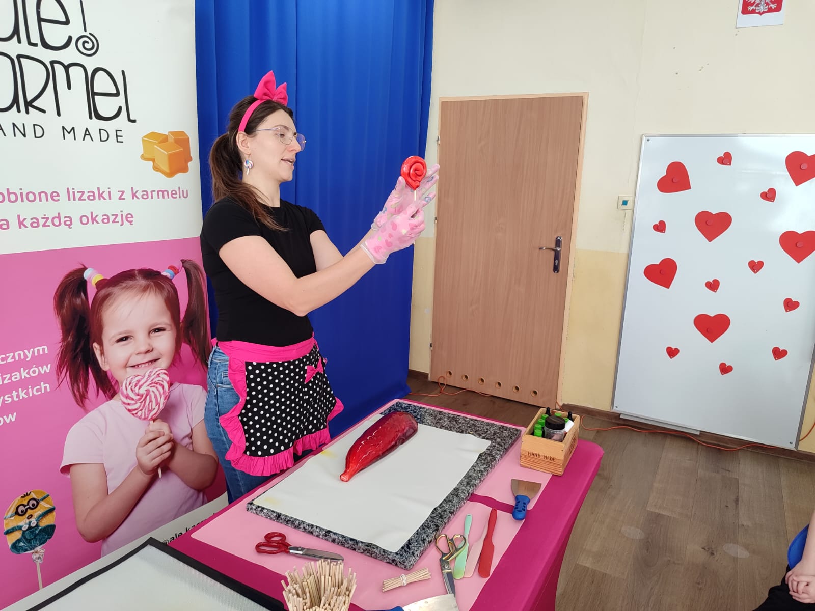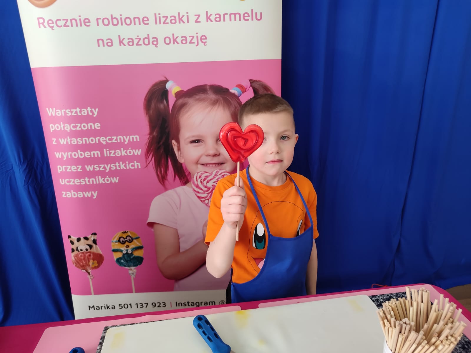 Dzieci miały możliwość wyboru smaku lizaka, który następnie własnoręcznie wykonały. Powstały piękne lizaki w kształcie serduszek o smaku malinowym. . Po zakończeniu pracy starszaki starannie zapakowały swoje wyroby.