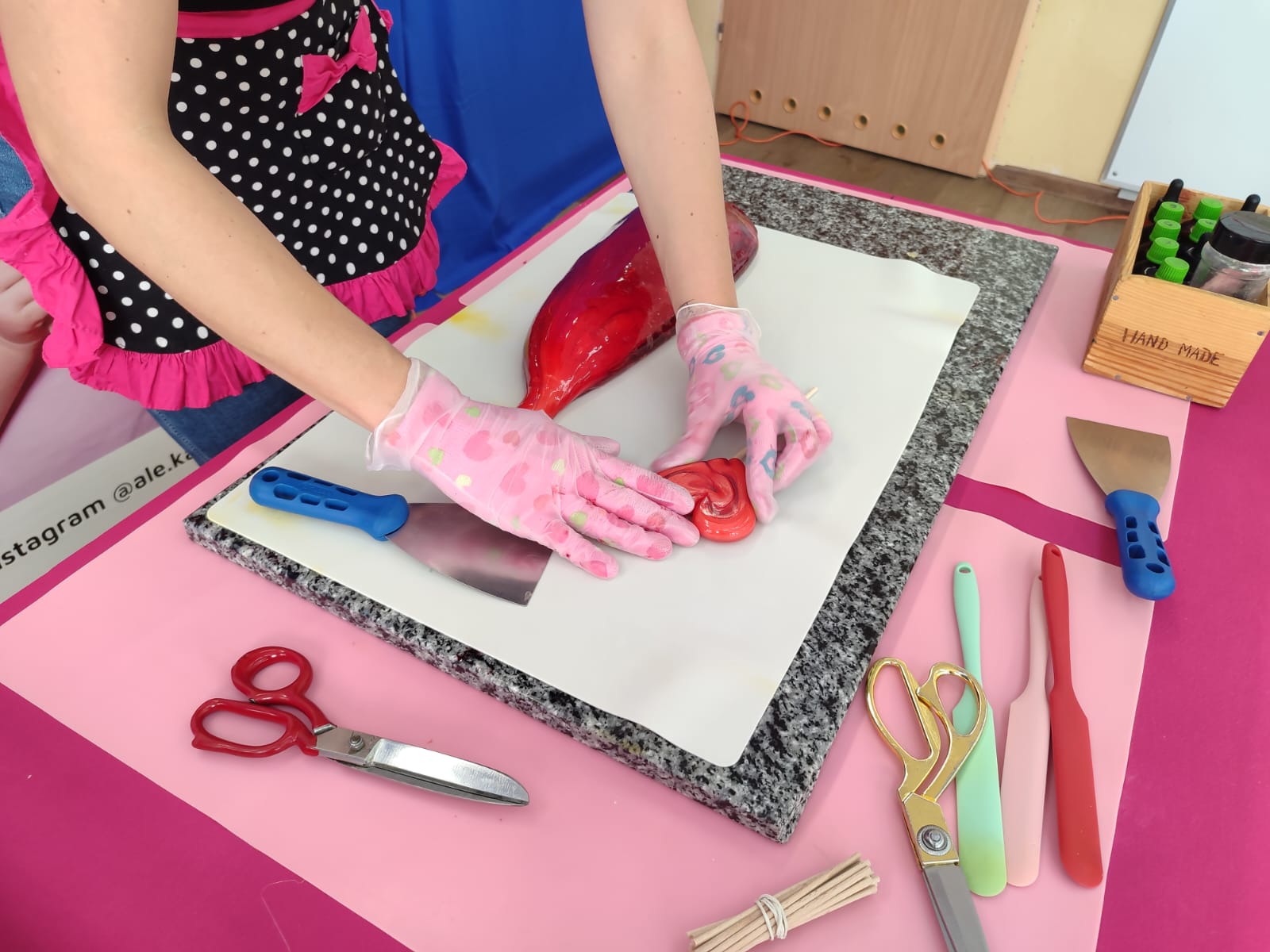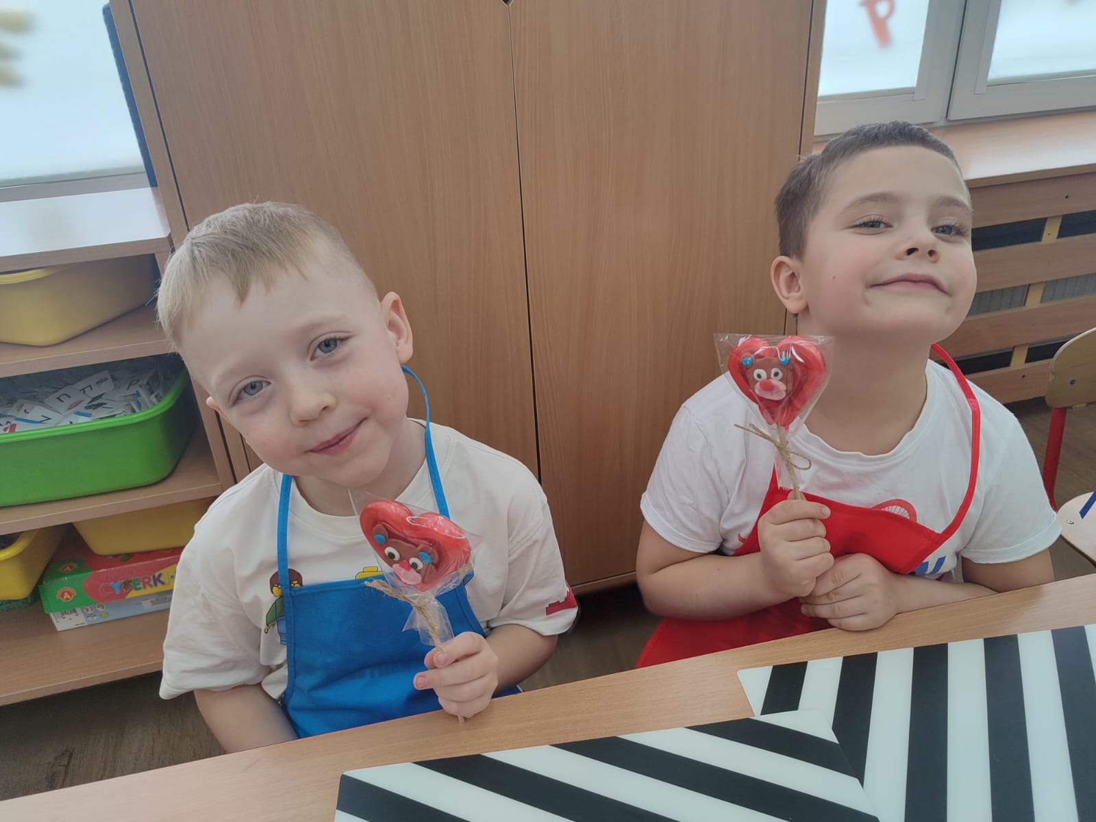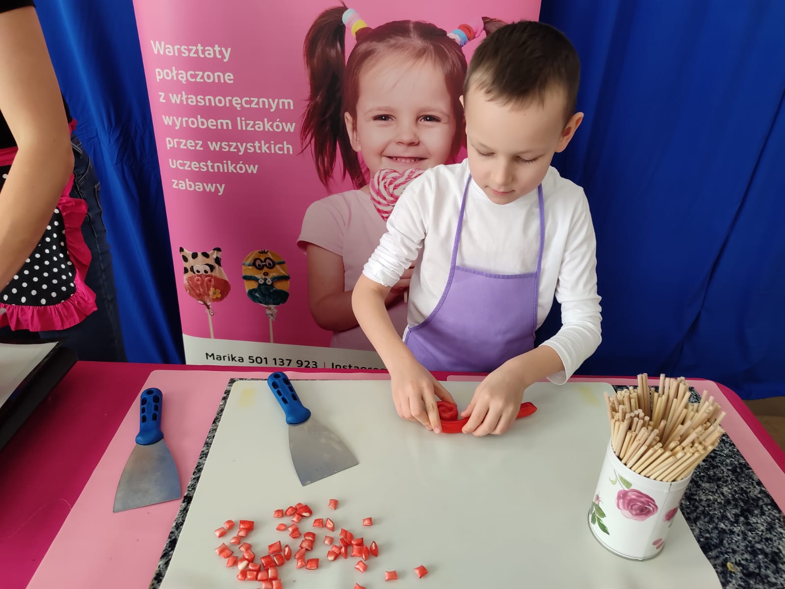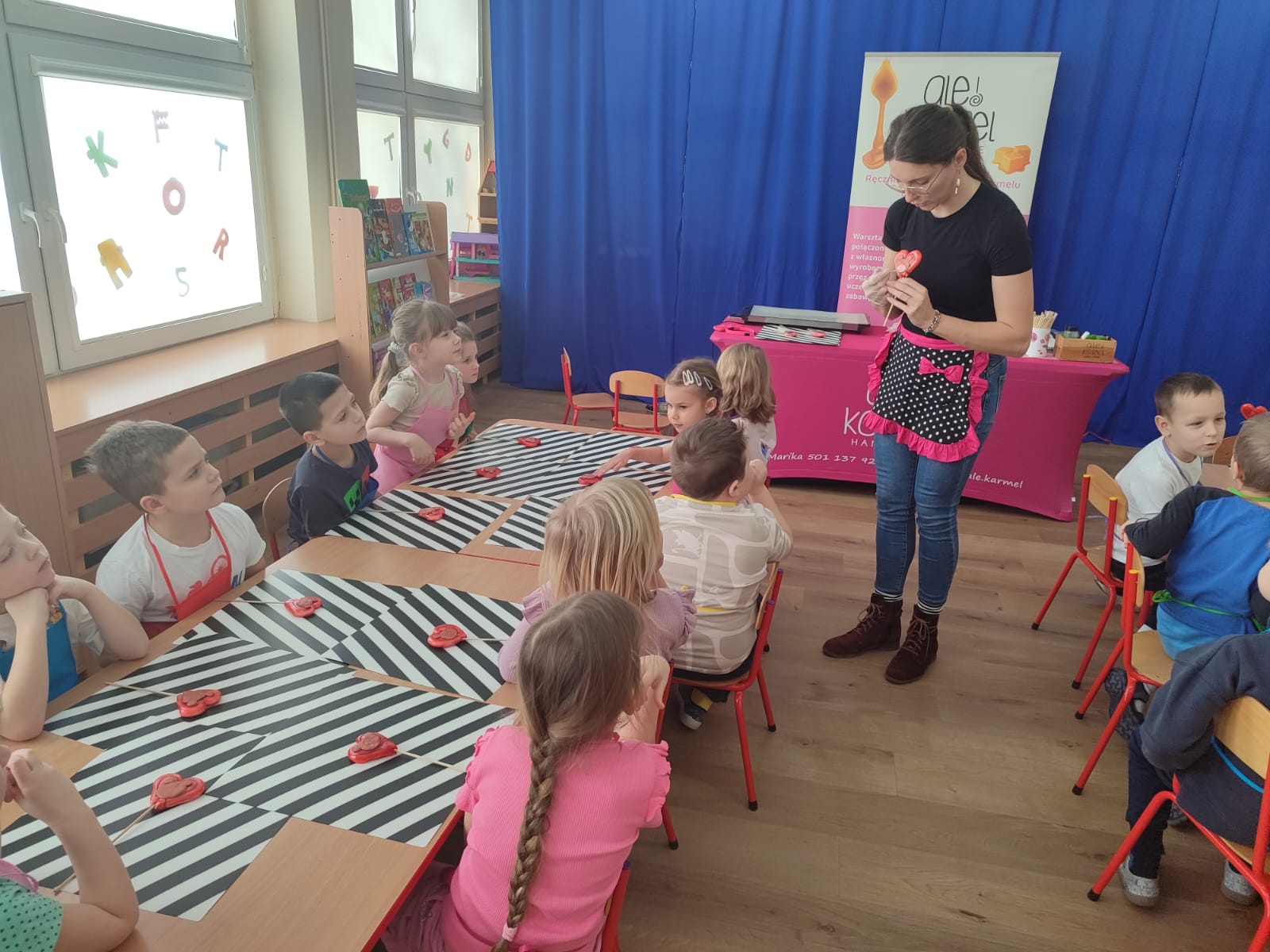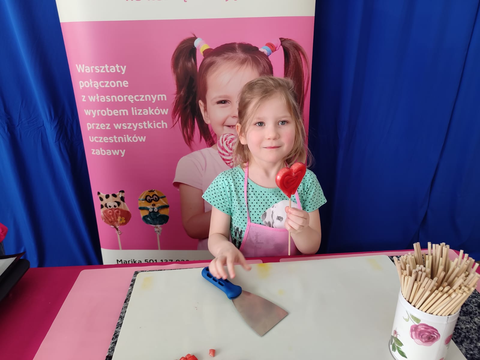 Dzieci miały możliwość wyboru smaku lizaka, który następnie własnoręcznie wykonały. Powstały piękne lizaki w kształcie serduszek o smaku malinowym. . Po zakończeniu pracy starszaki starannie zapakowały swoje wyroby.
