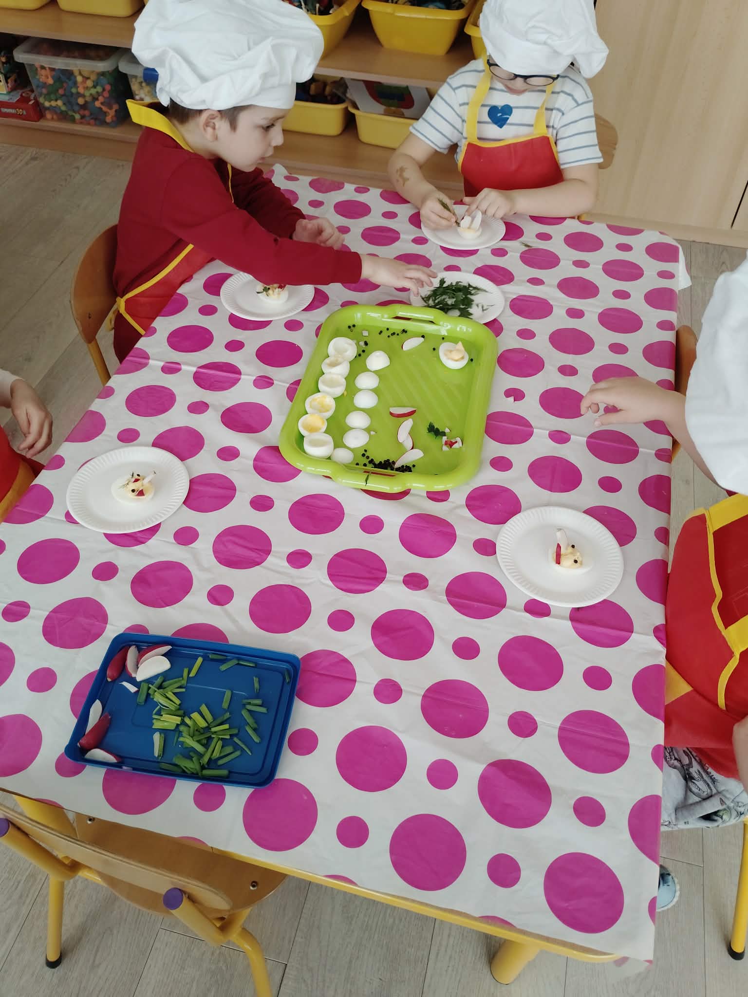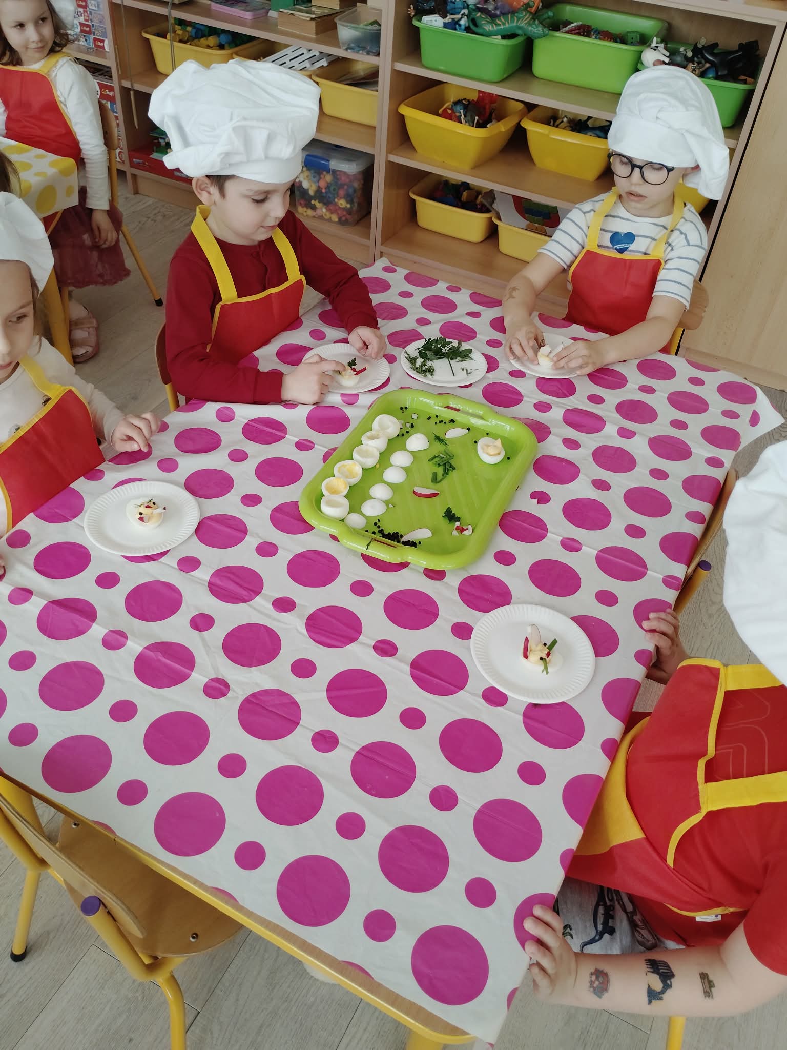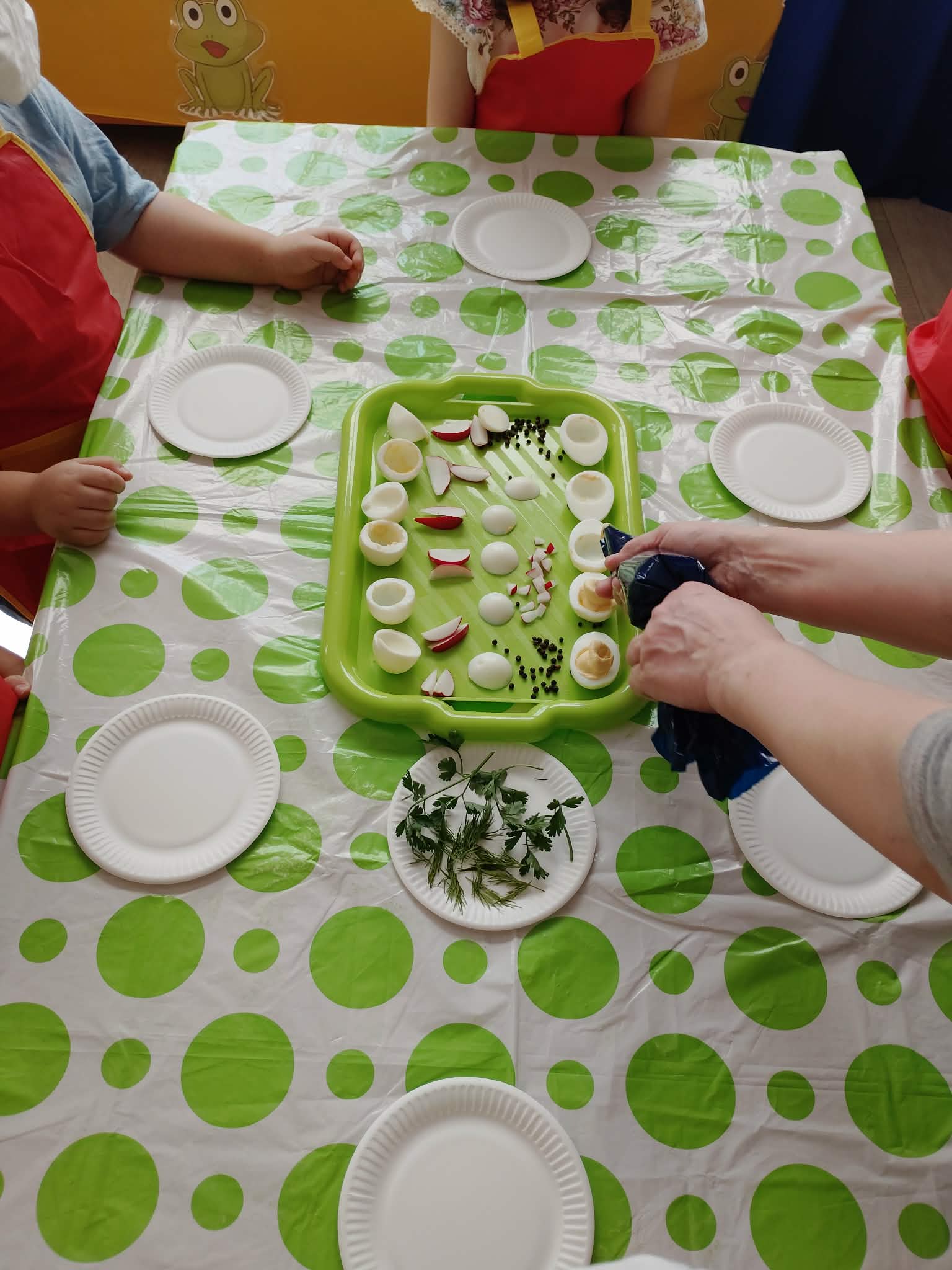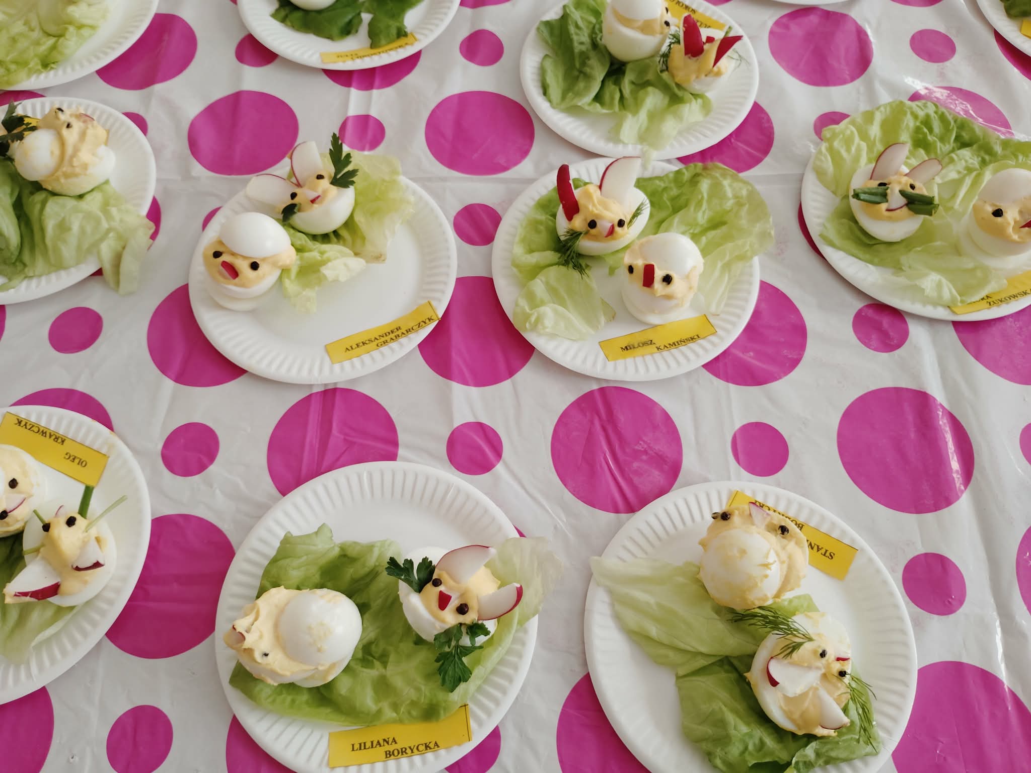 1 kwietna w gr.III odbyły się wyjątkowe warsztaty kulinarne o tematyce wielkanocnej. Dzieci z dużym zaangażowaniem uczestniczyły w przygotowywaniu jajek faszerowanych. Podczas zajęć przedszkolaki poznały kolejne etapy przygotowania potrawy – od obierania jajek, przez wydrążanie żółtek, aż po tworzenie farszu i dekorowanie gotowych dań.