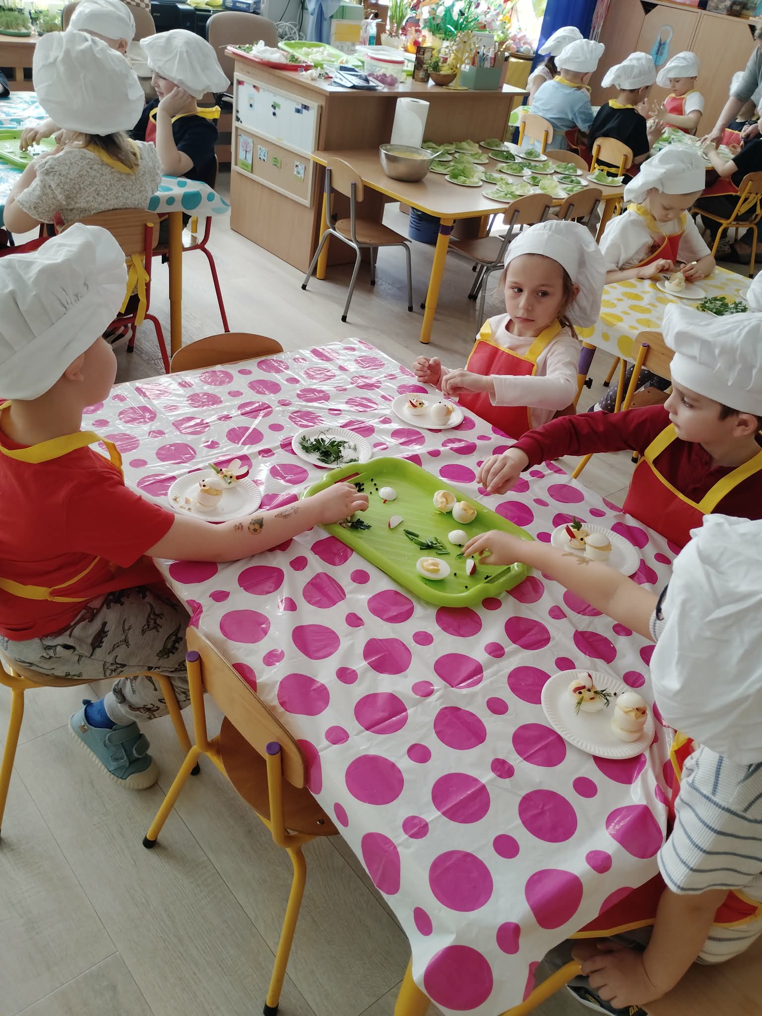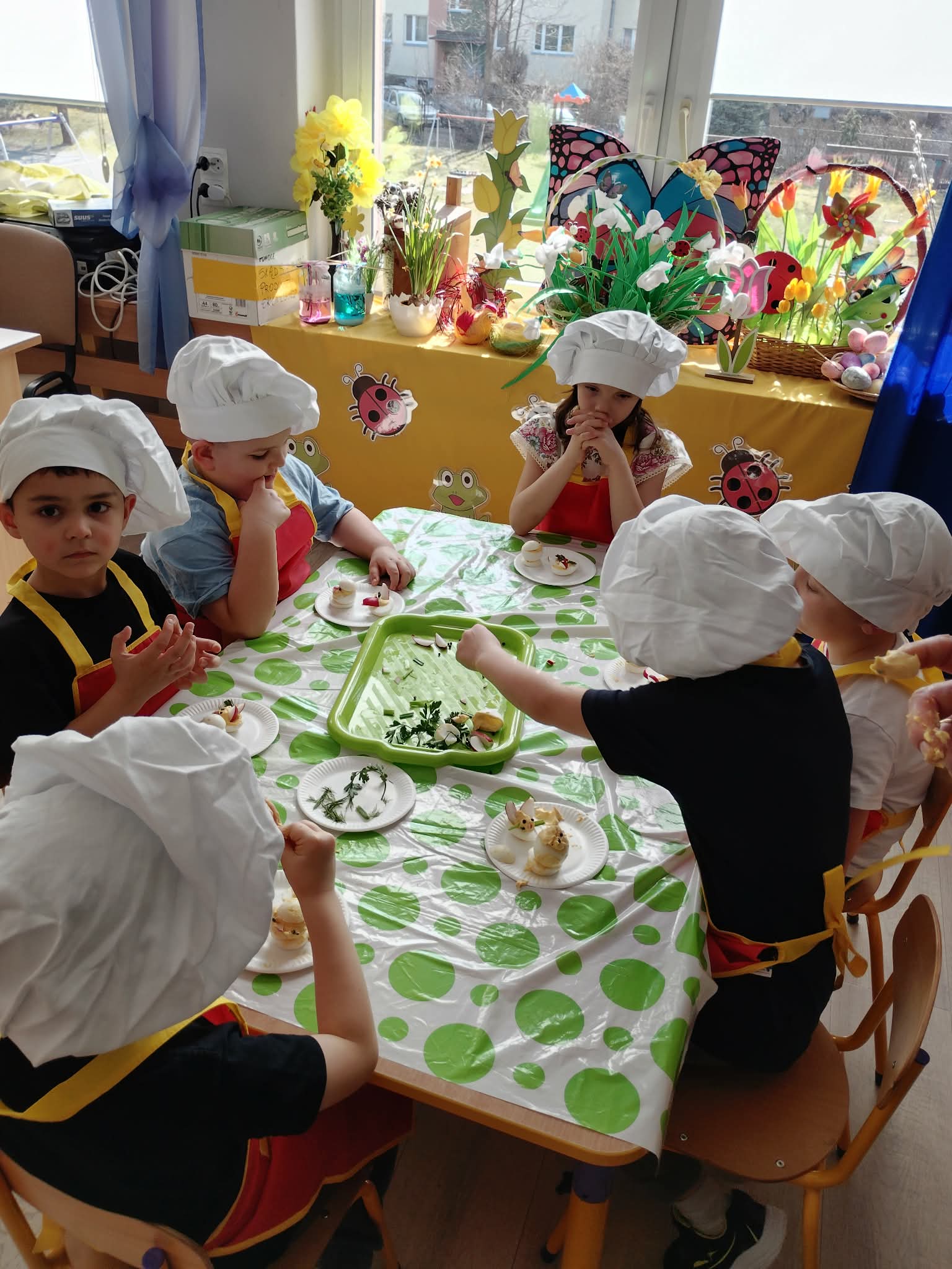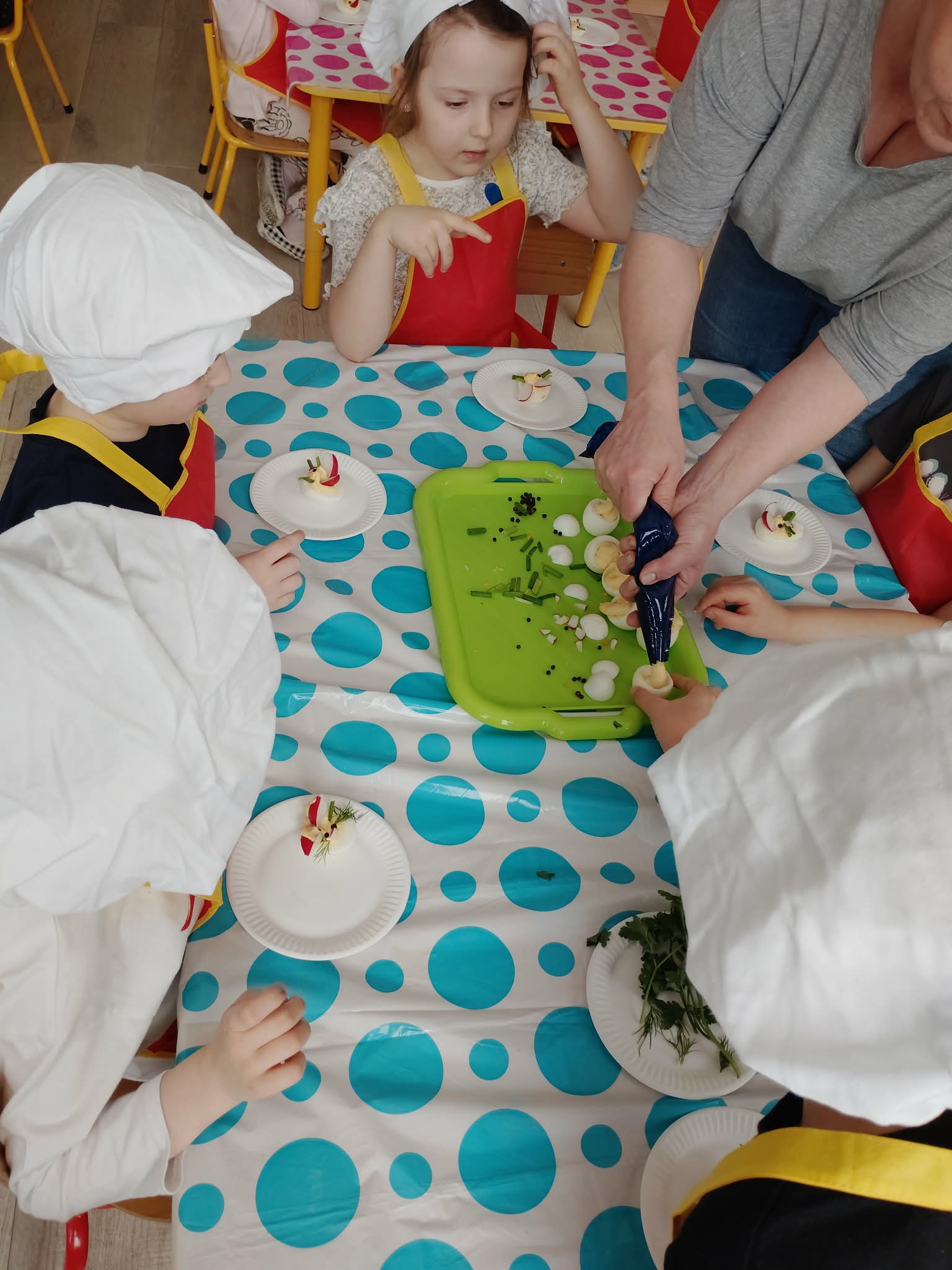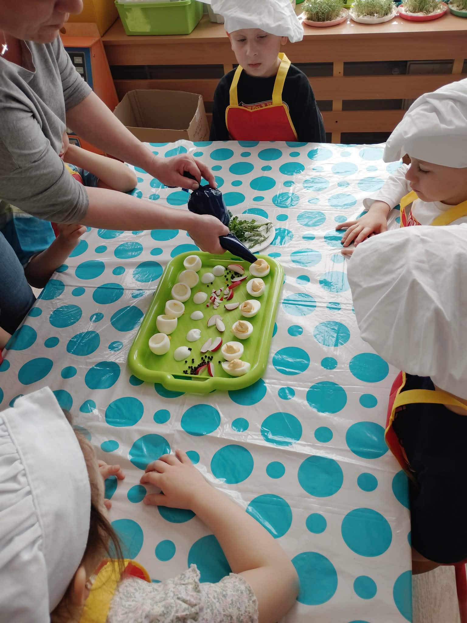 1 kwietna w gr.III odbyły się wyjątkowe warsztaty kulinarne o tematyce wielkanocnej. Dzieci z dużym zaangażowaniem uczestniczyły w przygotowywaniu jajek faszerowanych. Podczas zajęć przedszkolaki poznały kolejne etapy przygotowania potrawy – od obierania jajek, przez wydrążanie żółtek, aż po tworzenie farszu i dekorowanie gotowych dań.