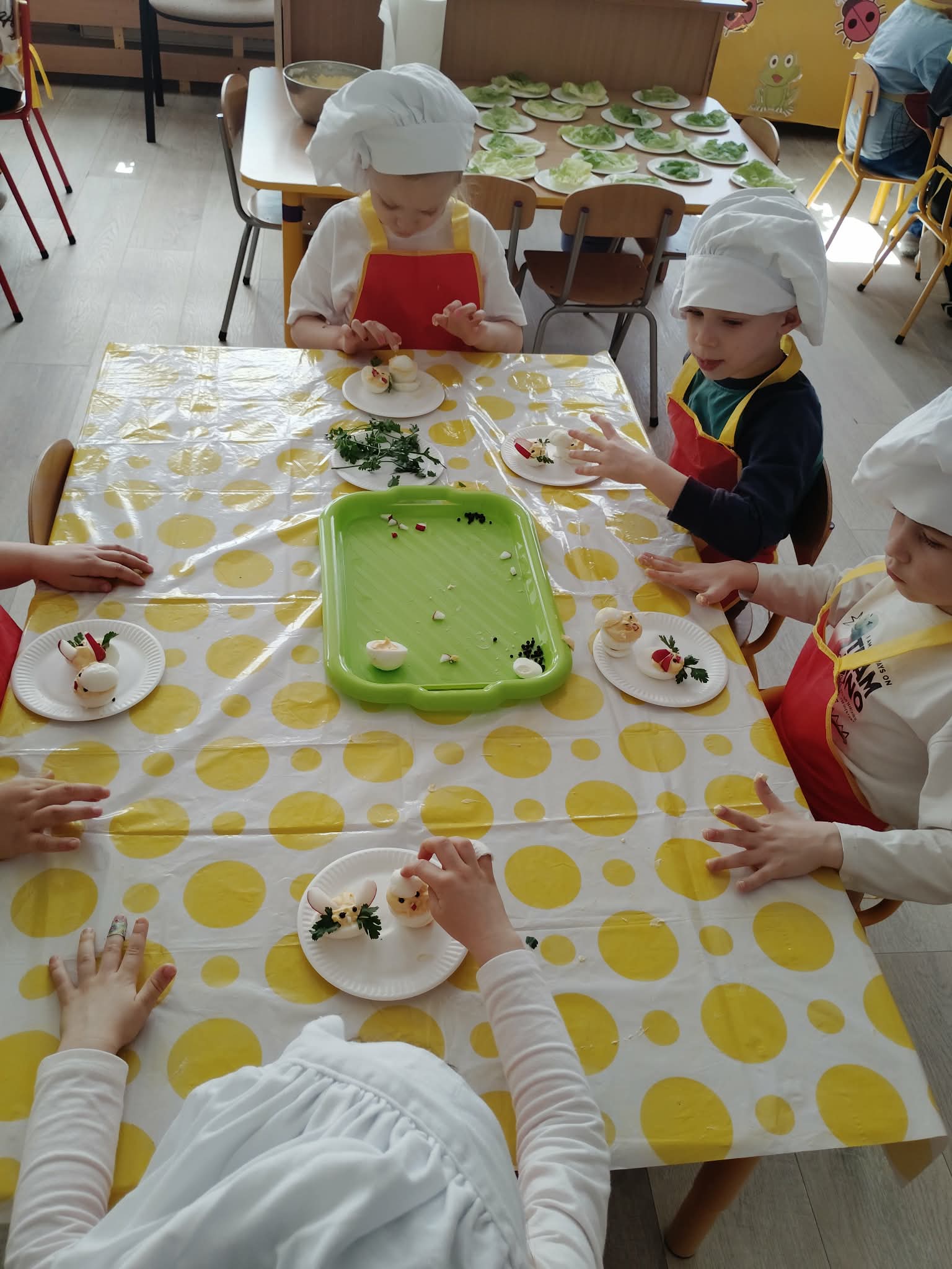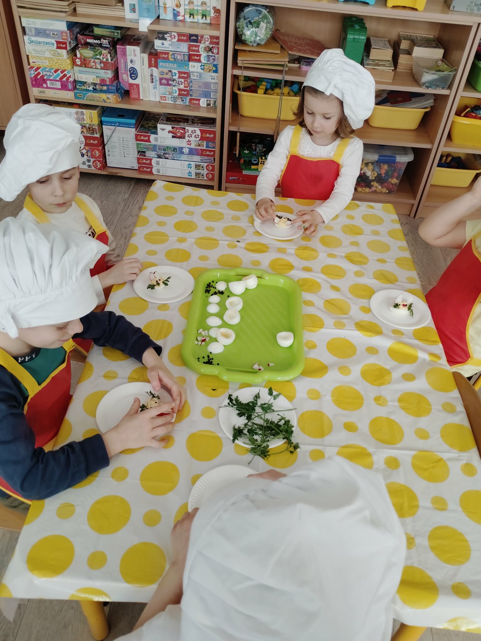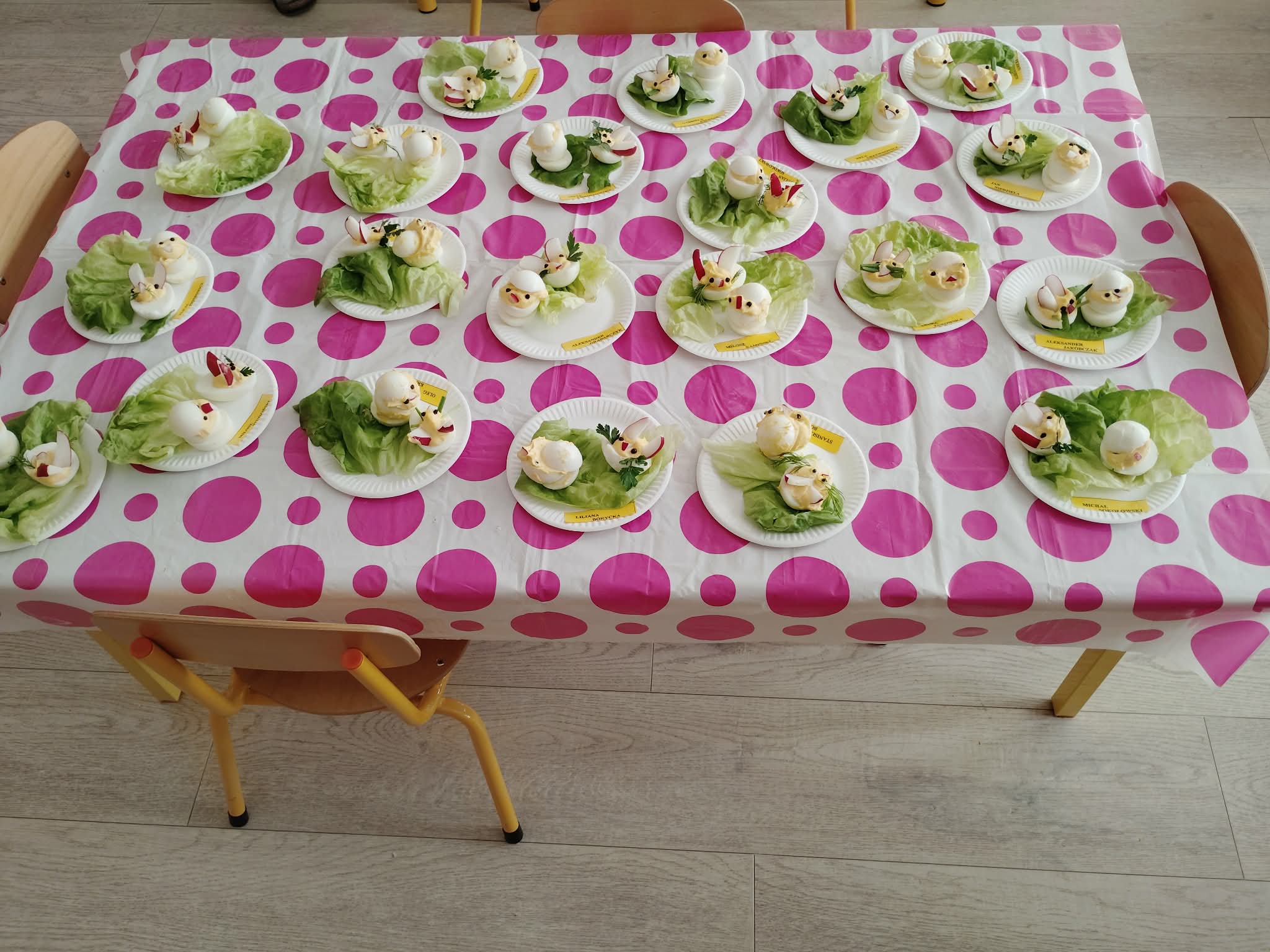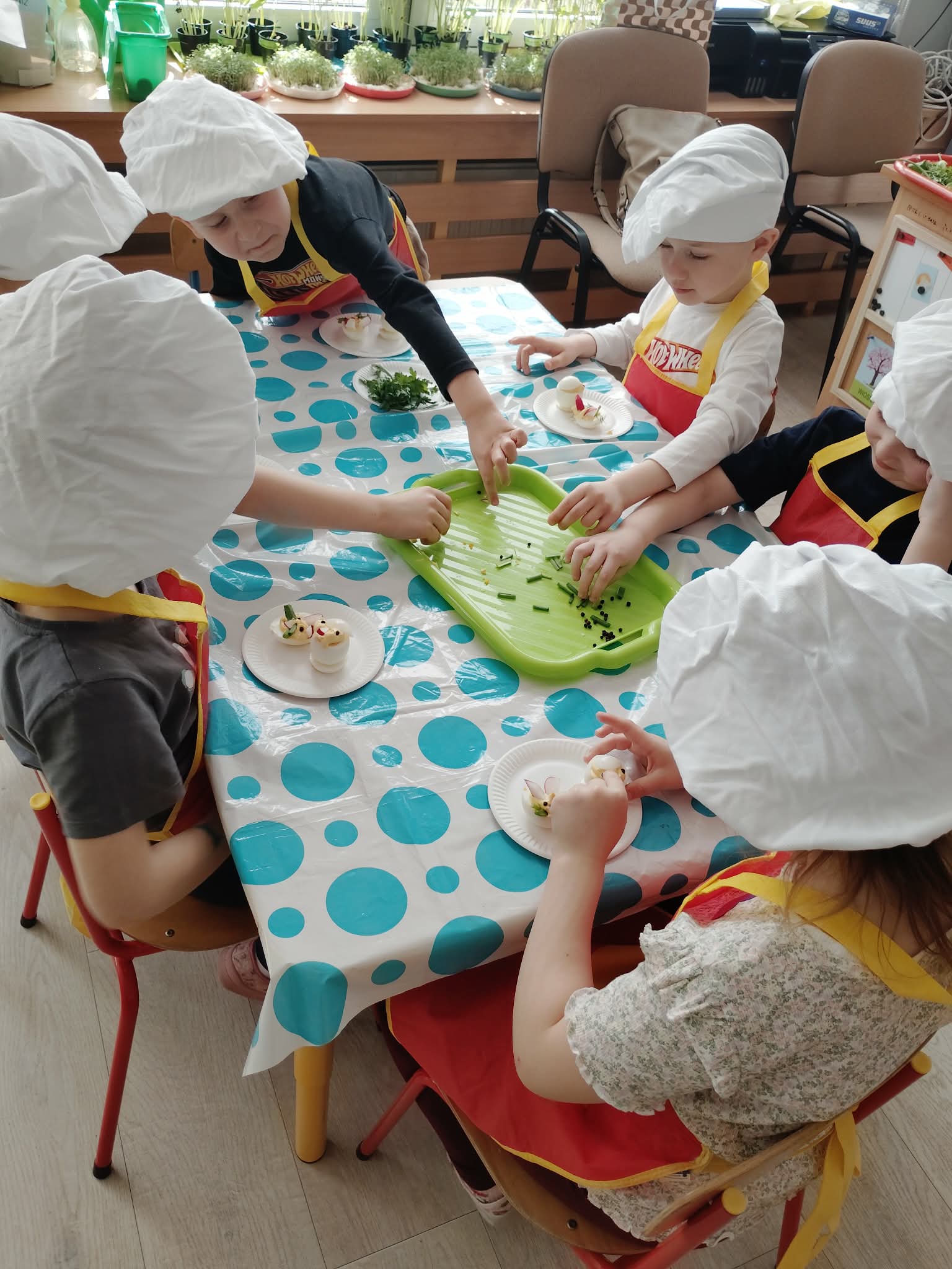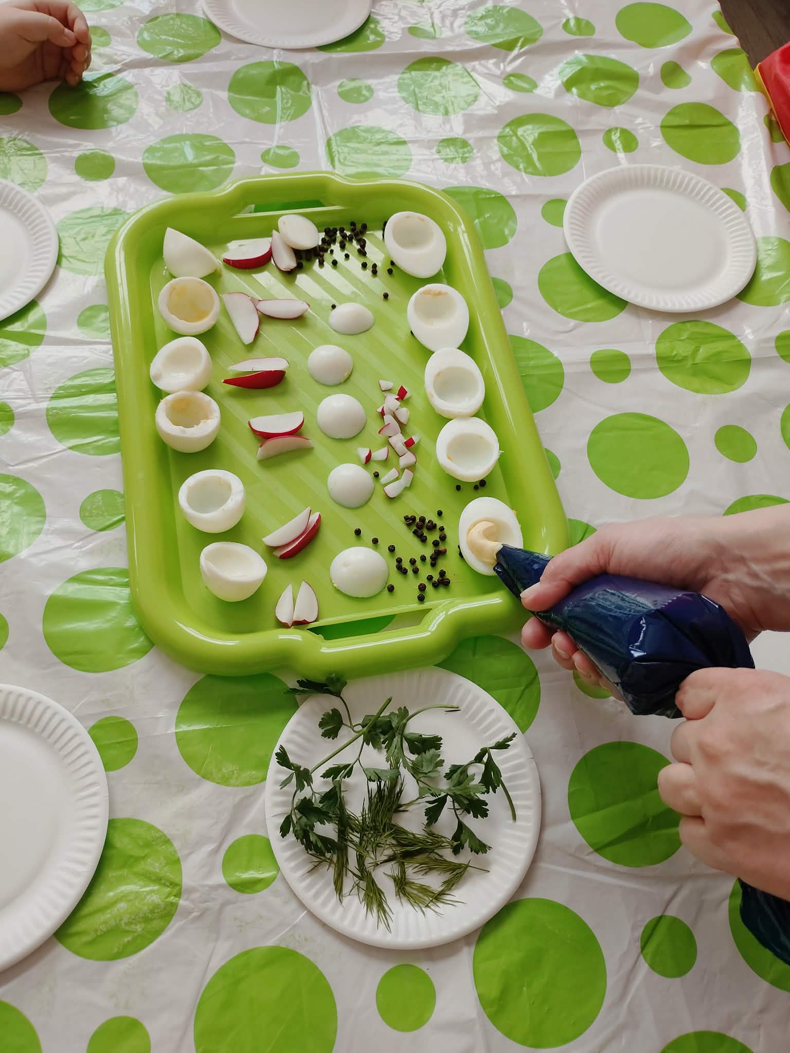 1 kwietna w gr.III odbyły się wyjątkowe warsztaty kulinarne o tematyce wielkanocnej. Dzieci z dużym zaangażowaniem uczestniczyły w przygotowywaniu jajek faszerowanych. Podczas zajęć przedszkolaki poznały kolejne etapy przygotowania potrawy – od obierania jajek, przez wydrążanie żółtek, aż po tworzenie farszu i dekorowanie gotowych dań.