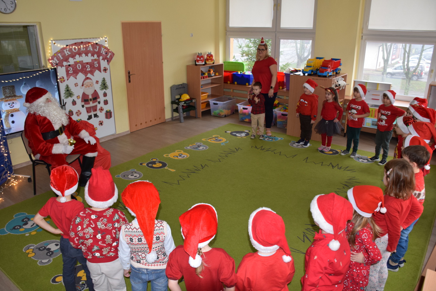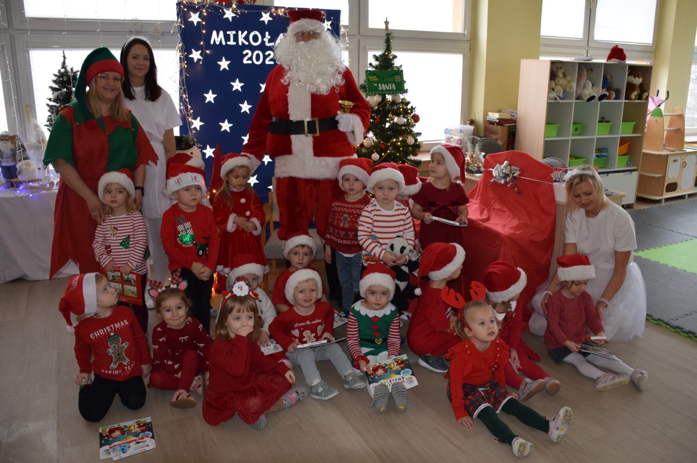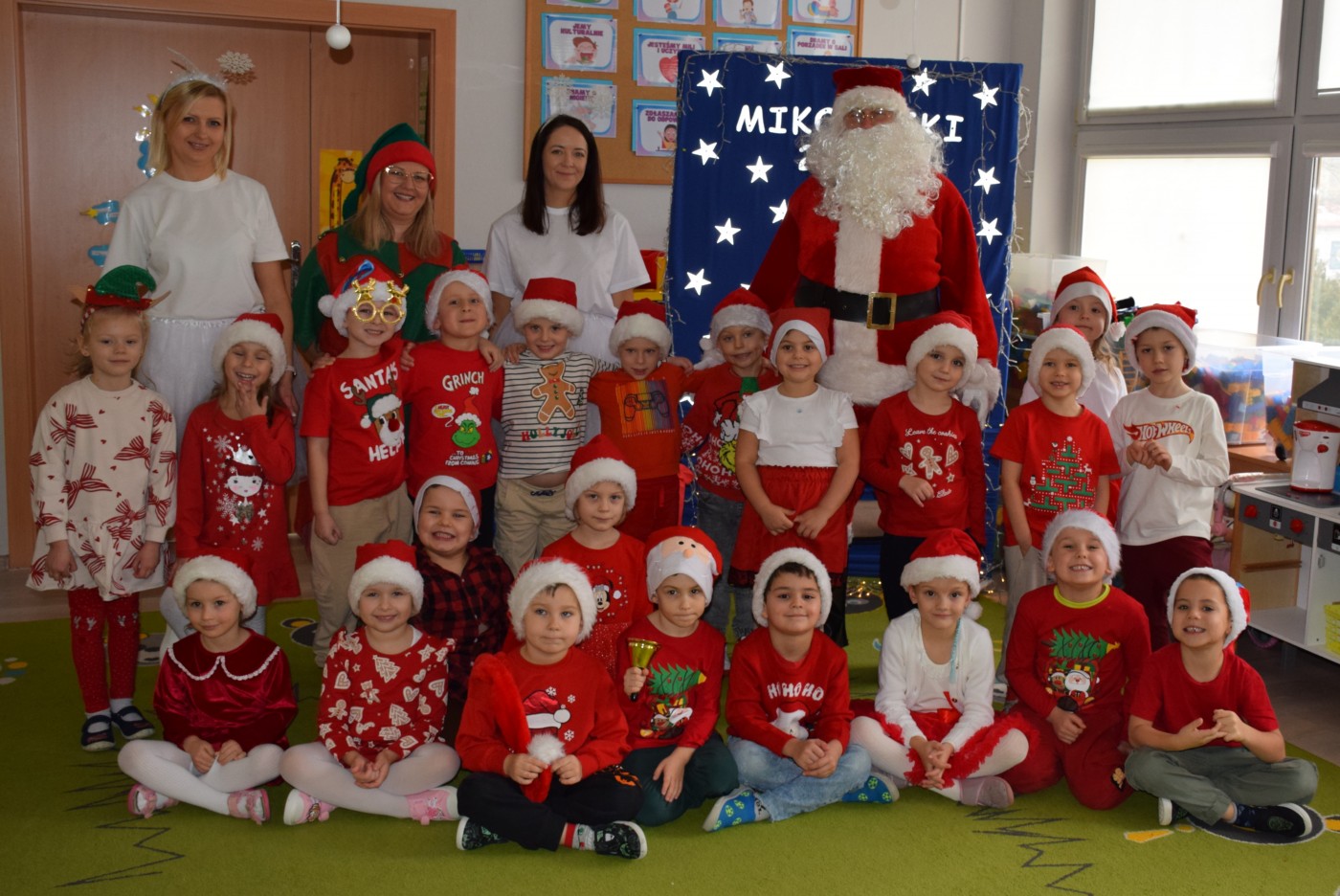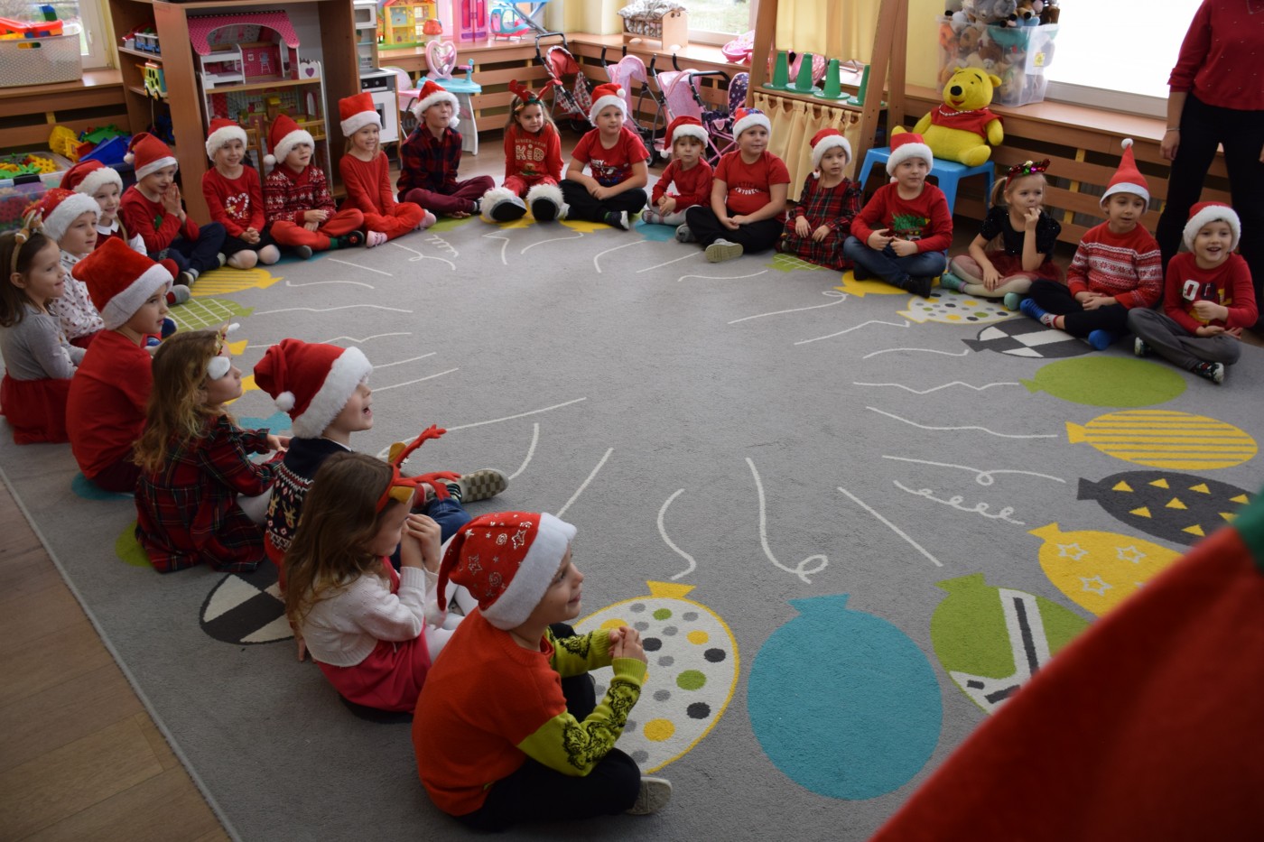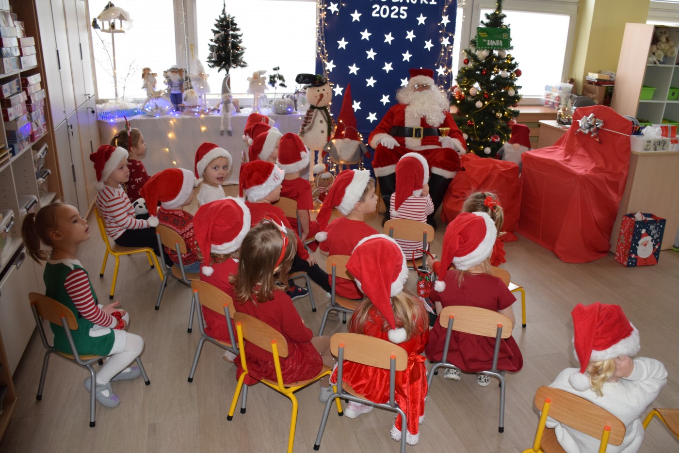 W tak bajkowej scenerii odwiedził nas niecodzienny gość – Święty Mikołaj, któremu towarzyszył pomocny Elf oraz trzy urocze Śnieżynki. Dzieci od samego rana były odświętnie ubrane – dominowała radosna czerwień, mikołajowe czapki i opaski z bożonarodzeniowymi motywami.