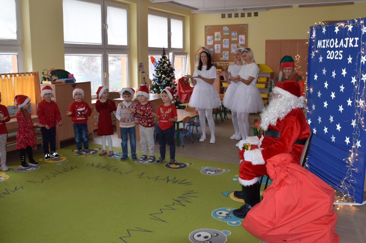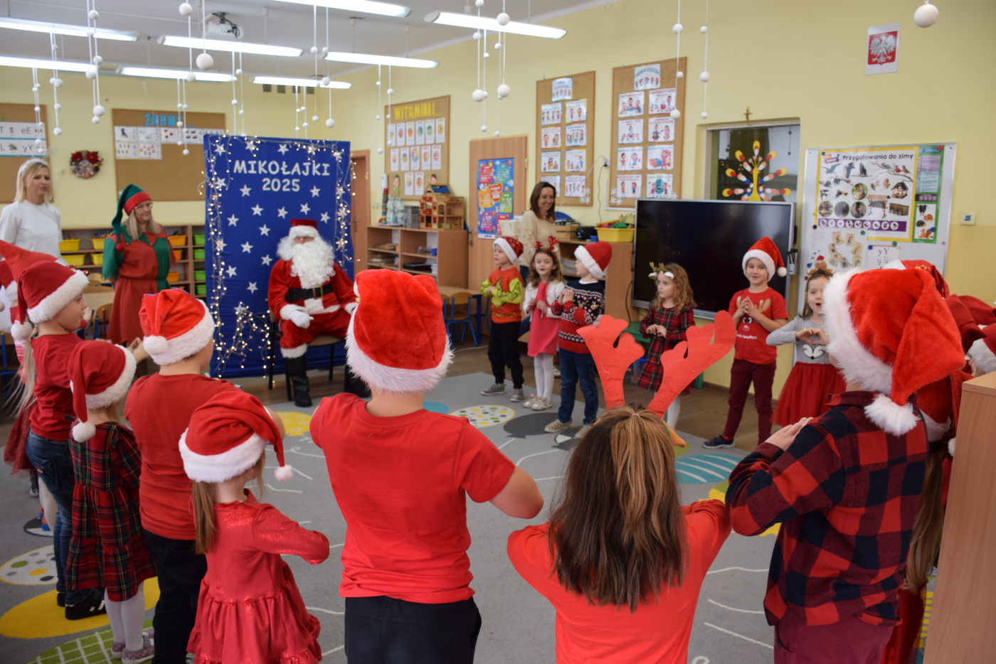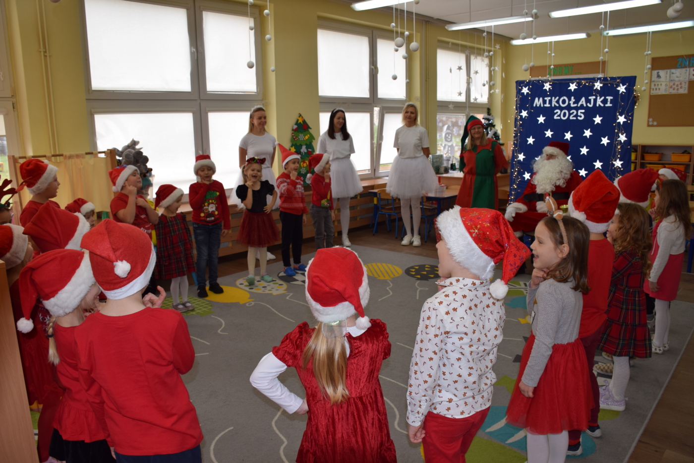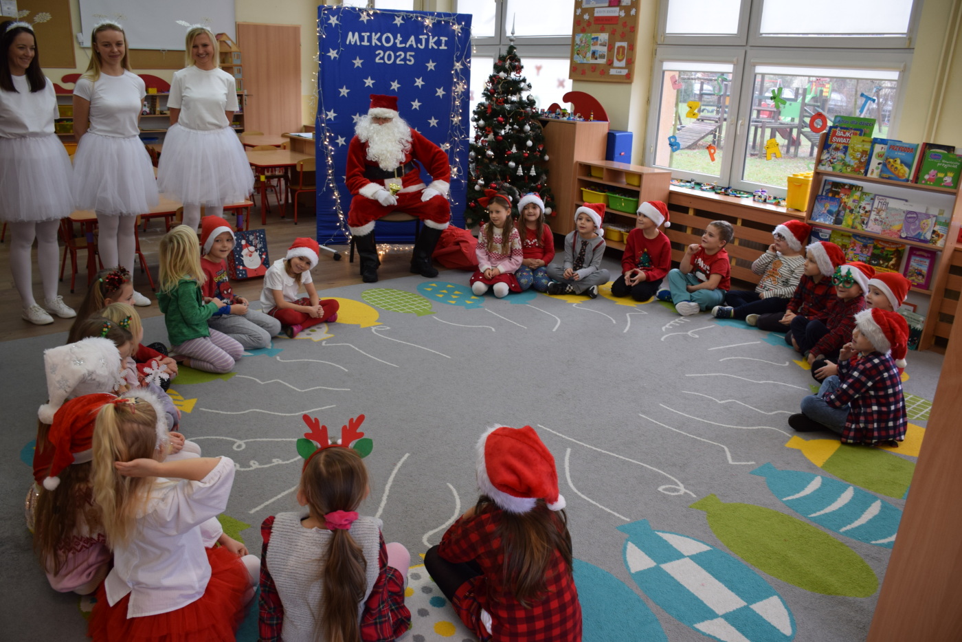W tak bajkowej scenerii odwiedził nas niecodzienny gość – Święty Mikołaj, któremu towarzyszył pomocny Elf oraz trzy urocze Śnieżynki. Dzieci od samego rana były odświętnie ubrane – dominowała radosna czerwień, mikołajowe czapki i opaski z bożonarodzeniowymi motywami.