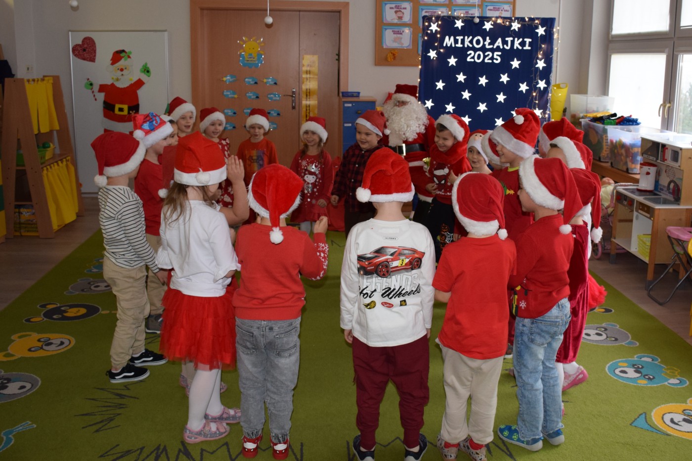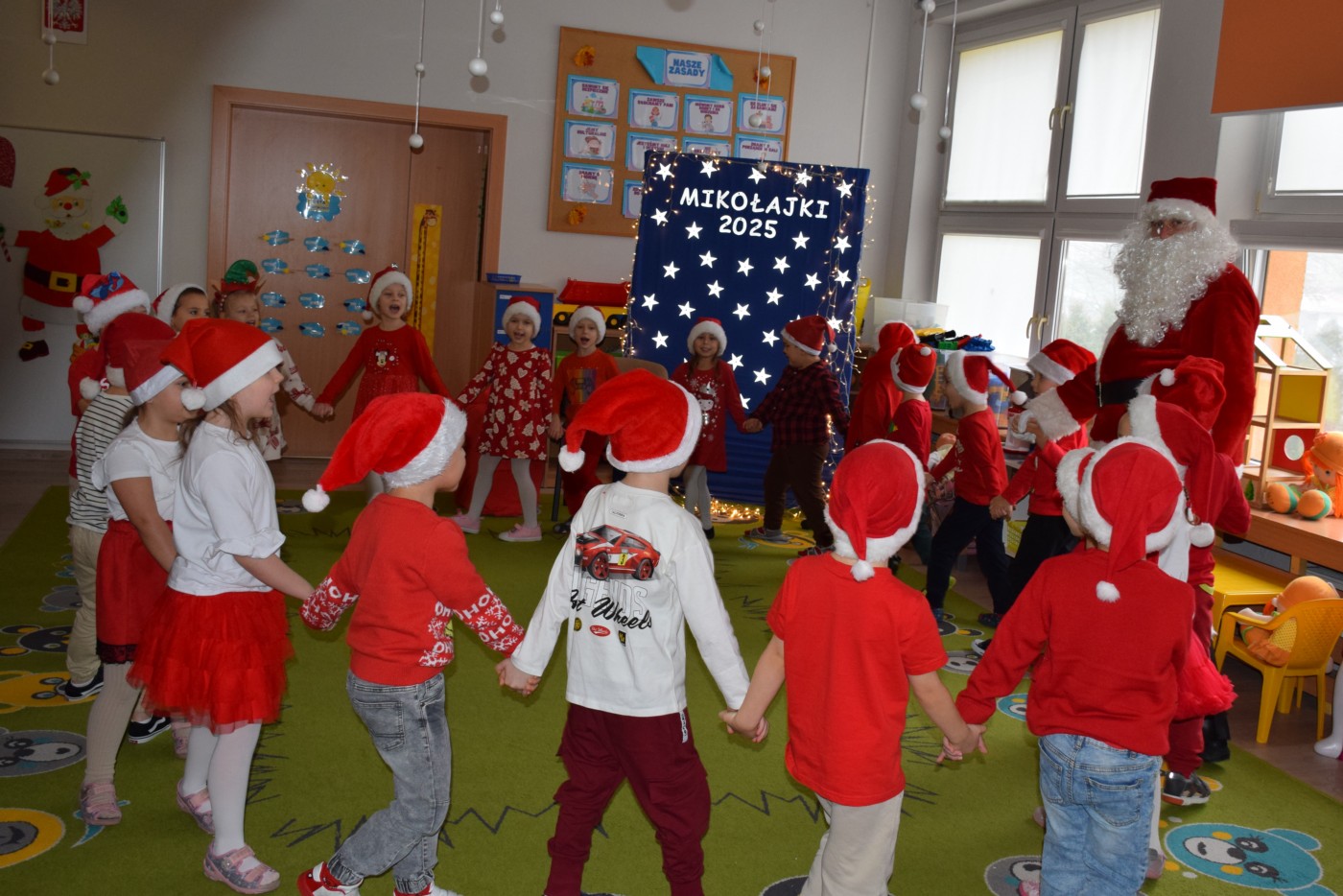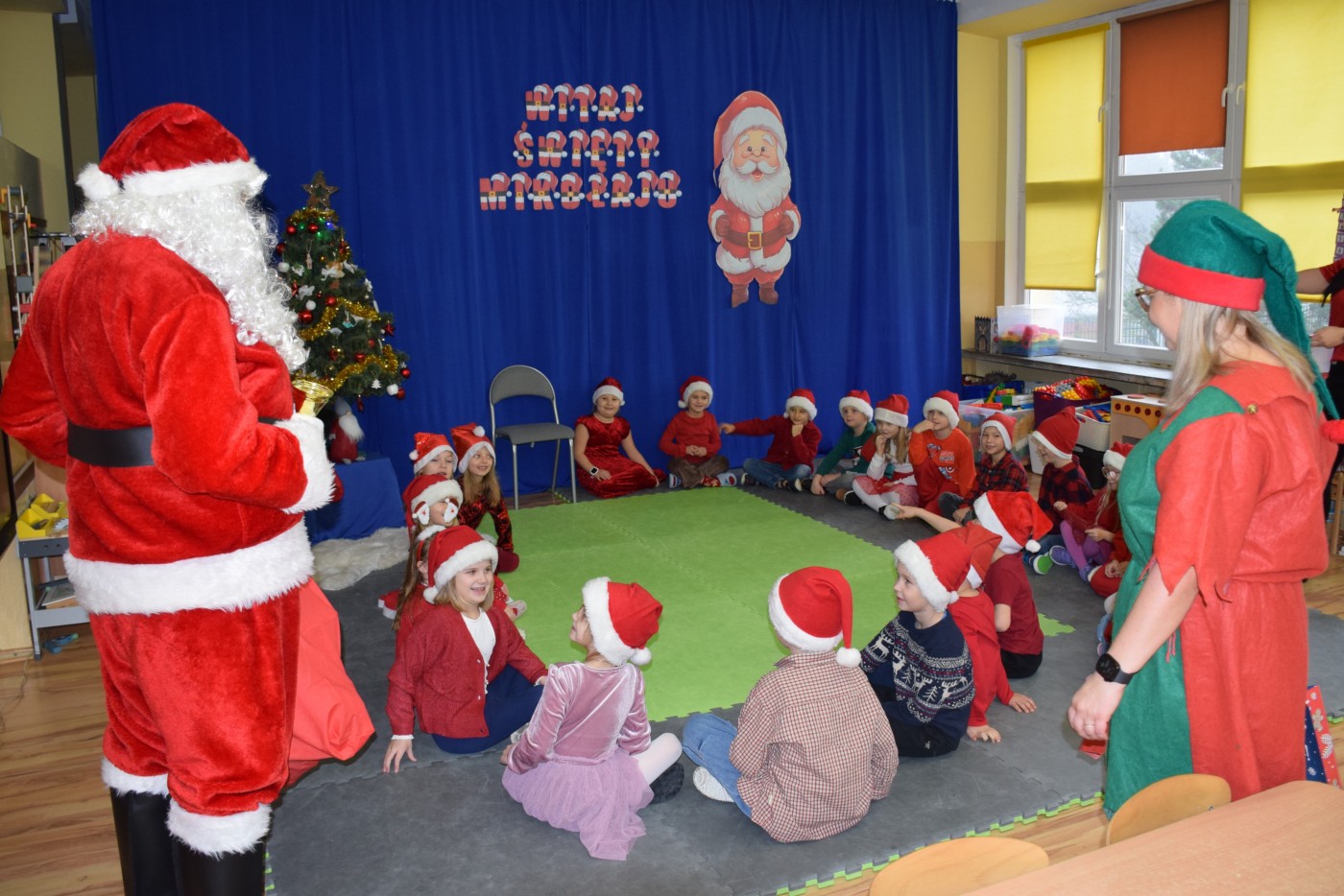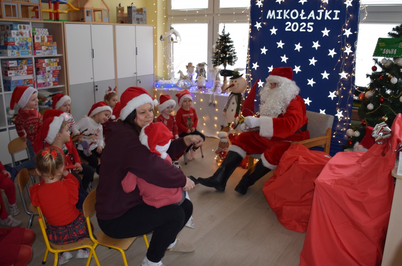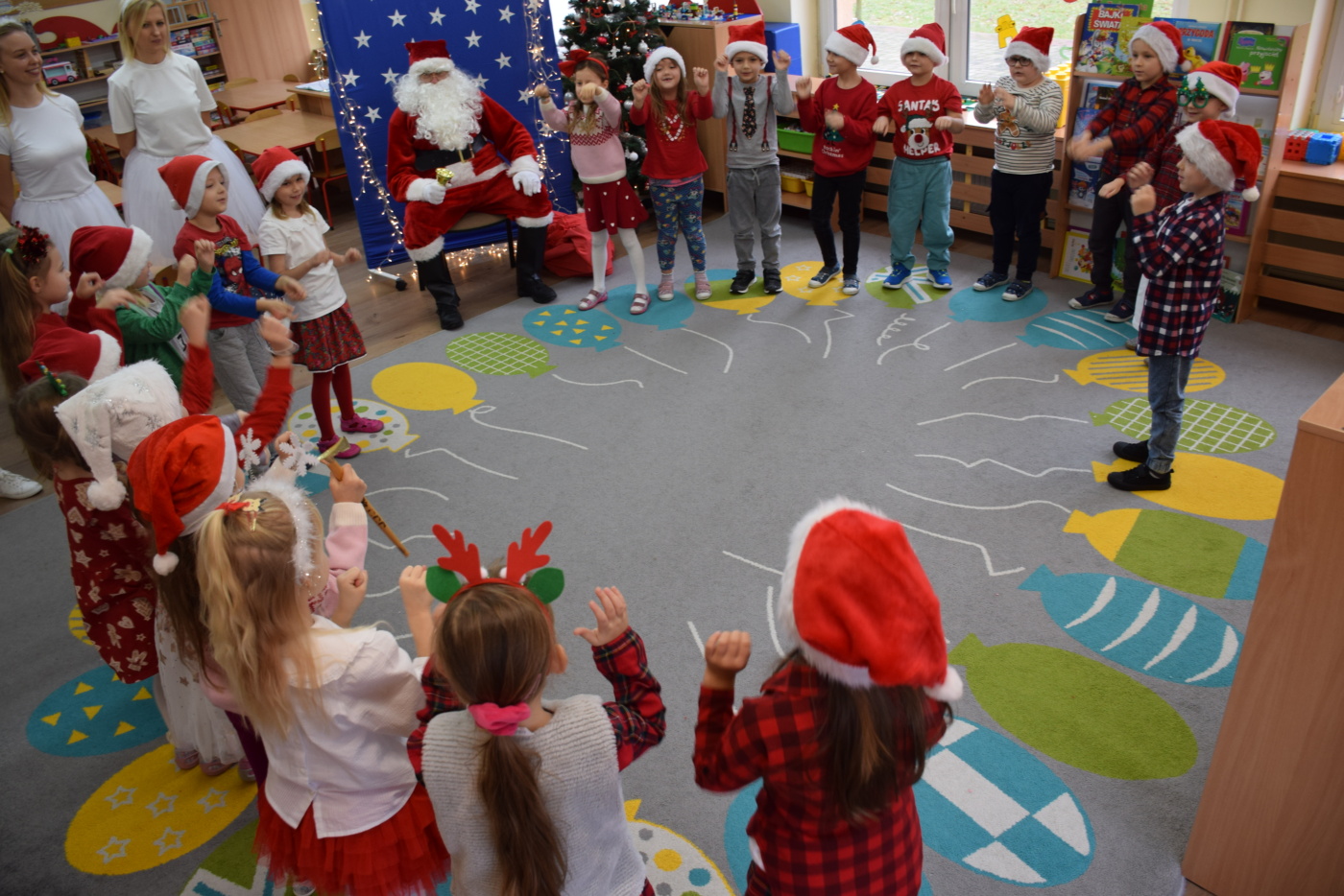 W tak bajkowej scenerii odwiedził nas niecodzienny gość – Święty Mikołaj, któremu towarzyszył pomocny Elf oraz trzy urocze Śnieżynki. Dzieci od samego rana były odświętnie ubrane – dominowała radosna czerwień, mikołajowe czapki i opaski z bożonarodzeniowymi motywami.