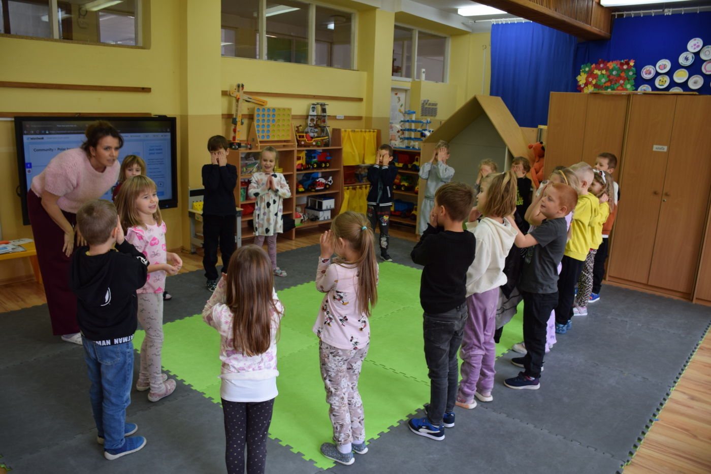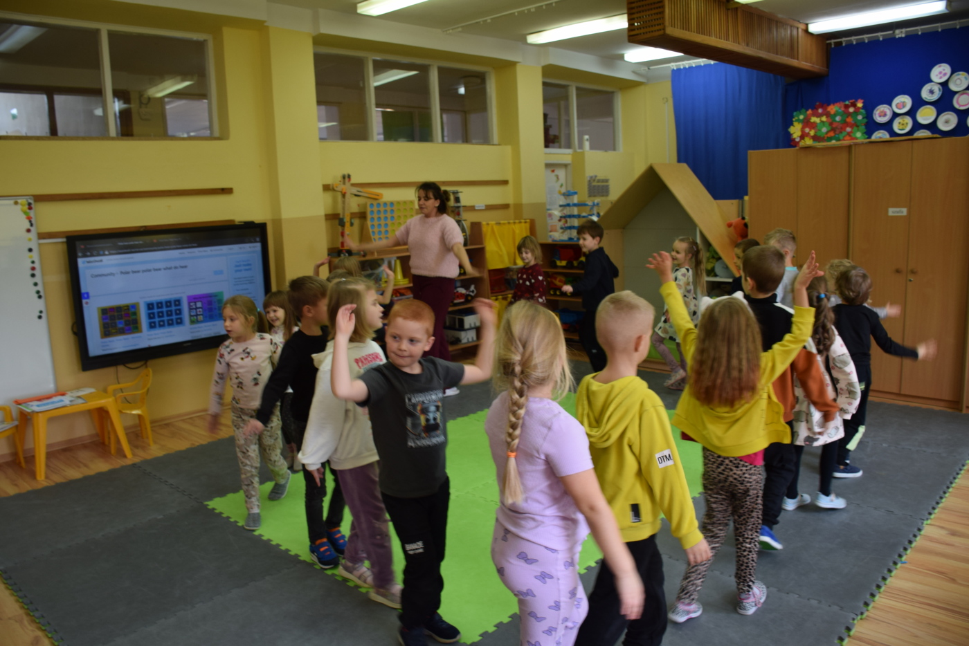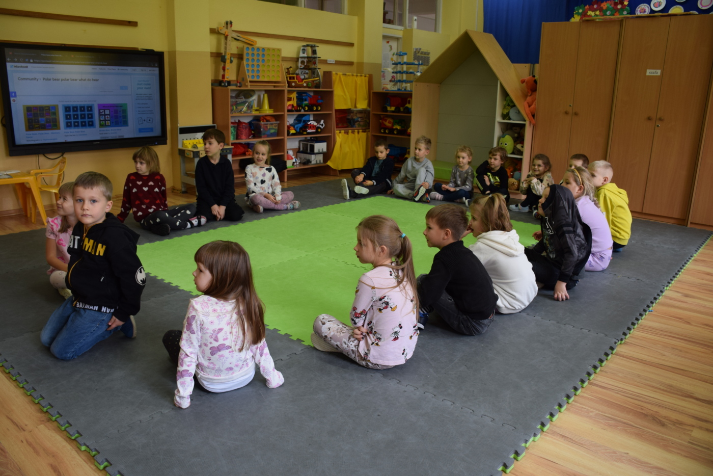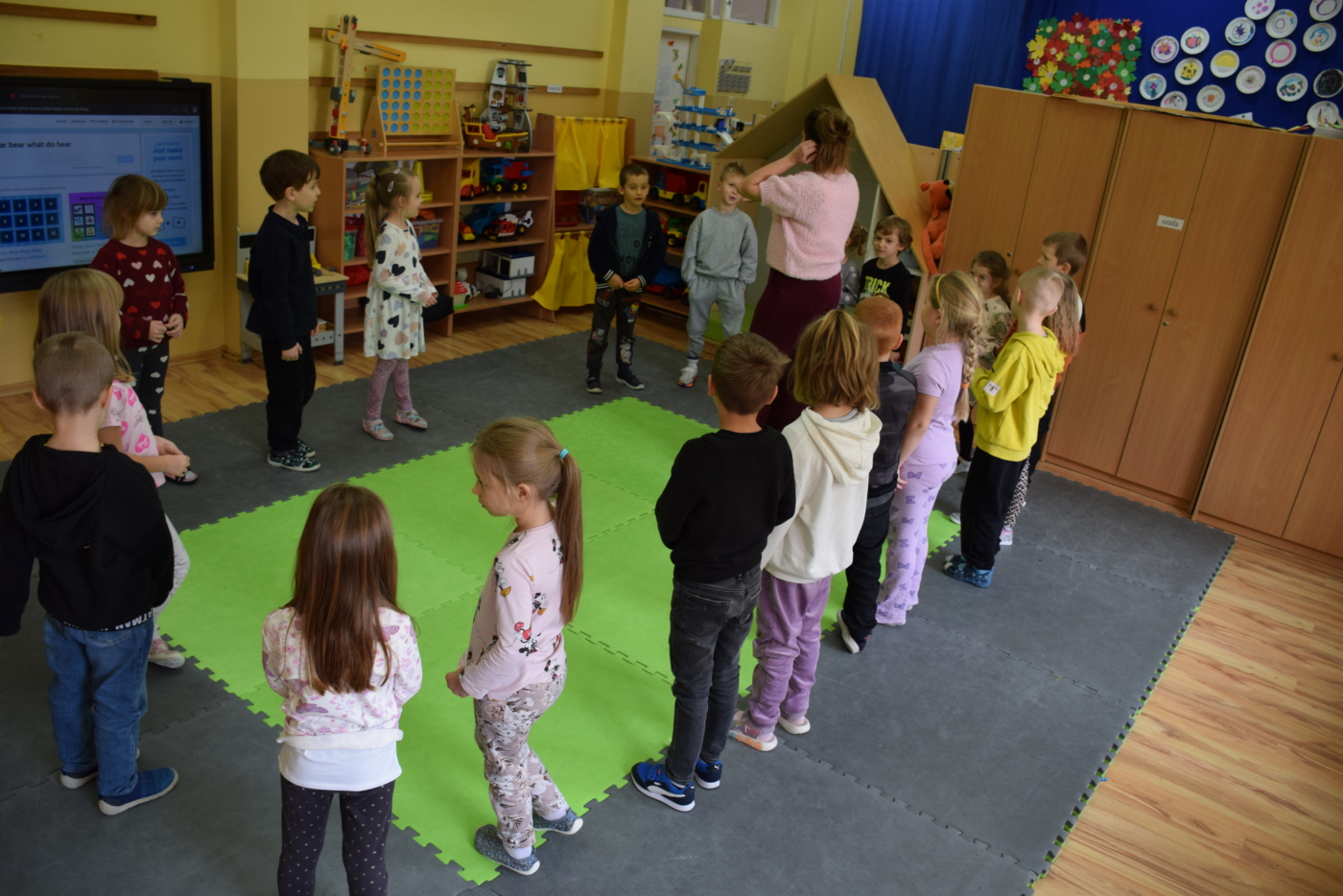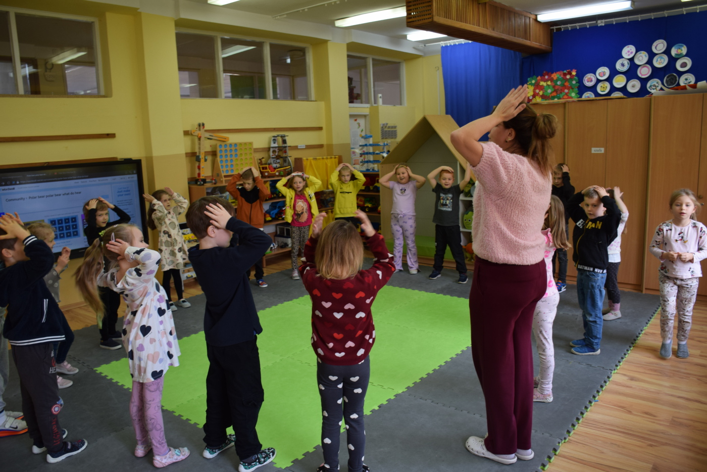 Dzieci były bardzo skupione i zainteresowane, doskonale rozumiały wszystkie polecenia, kierowane do nich wyłącznie w języku angielskim, wykonując każde zadanie z olbrzymim zaangażowaniem i entuzjazmem, a na zajęciach działo się bardzo dużo… Między innymi dzieci chętnie śpiewały znane im piosenki w języku angielskim, recytowały wiersze, utrwalały znane im zwroty, pytania odpowiedzi, słownictwo. Dzieci znają i nazywają kolory, części ciała, słownictwo związane z tematyką jesienną, nazwy zwierząt, potrafiły określić i nazwać nastroje ludzi, pogodę, znają pory roku, miesiące, alfabet. Odczytują globalnie nazwy np. uczuć.
