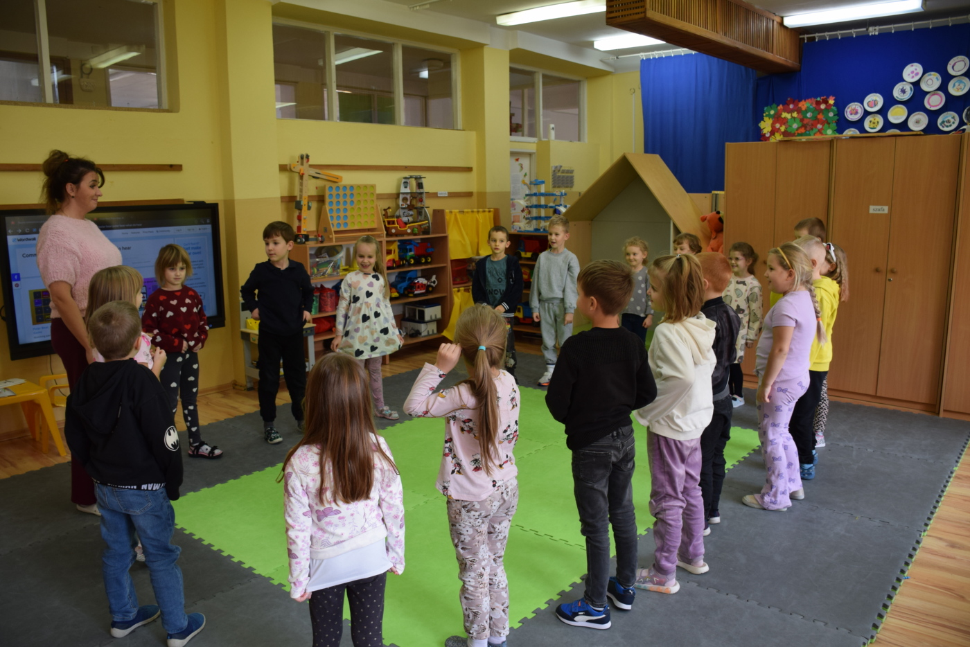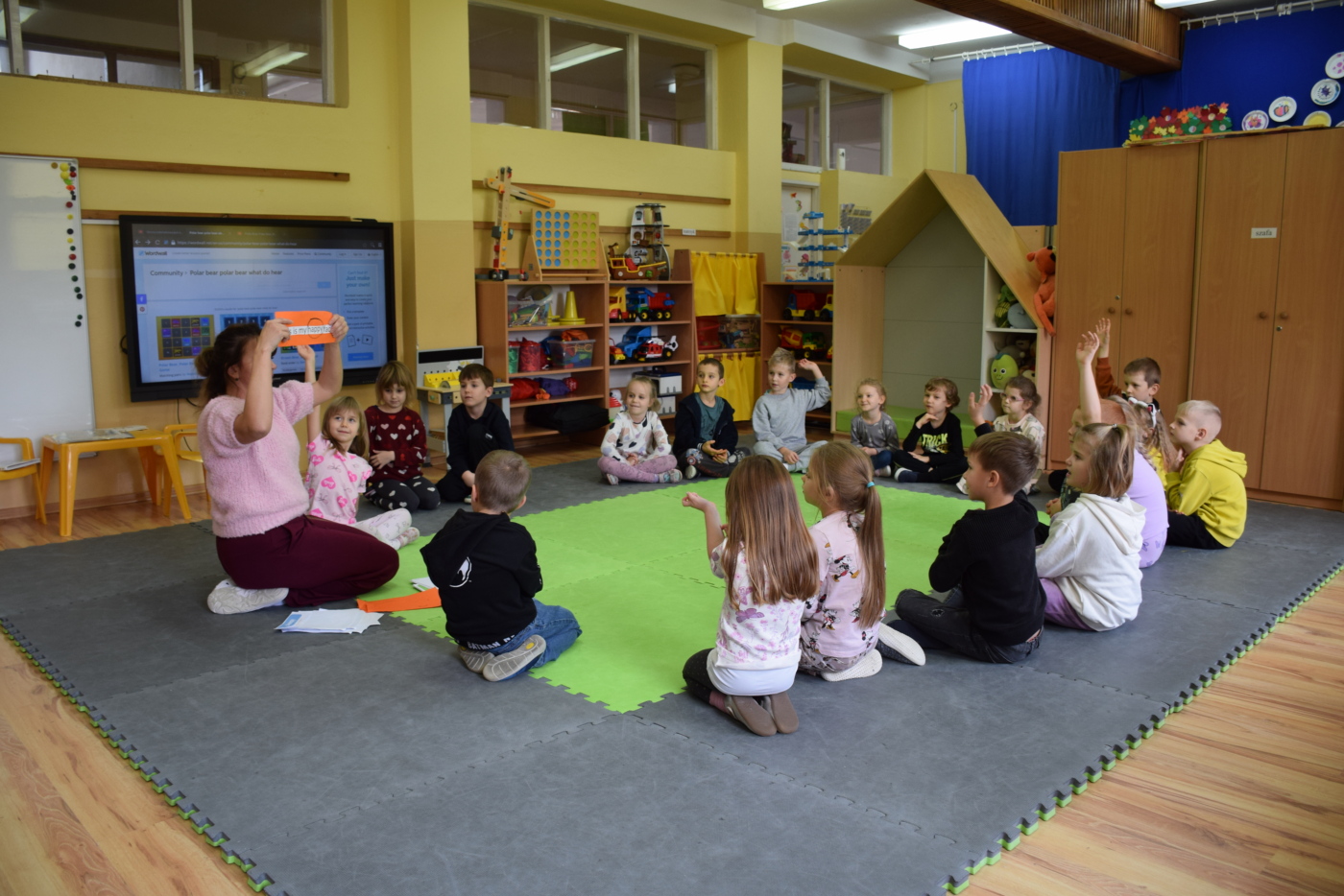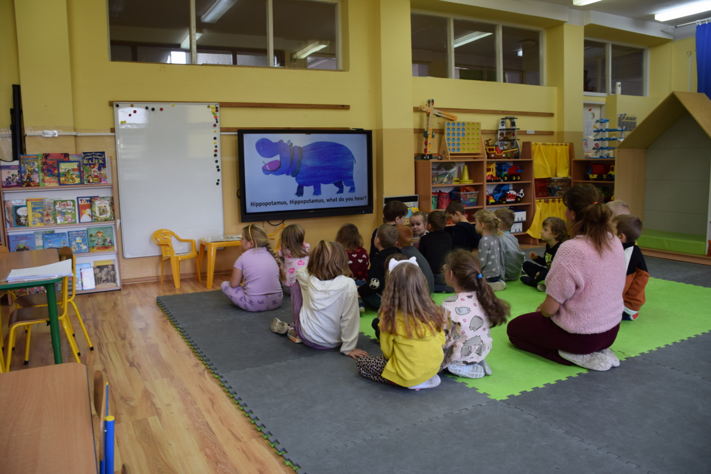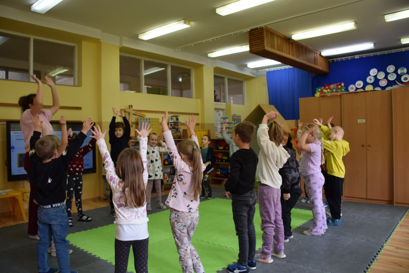 Dzieci były bardzo skupione i zainteresowane, doskonale rozumiały wszystkie polecenia, kierowane do nich wyłącznie w języku angielskim, wykonując każde zadanie z olbrzymim zaangażowaniem i entuzjazmem, a na zajęciach działo się bardzo dużo… Między innymi dzieci chętnie śpiewały znane im piosenki w języku angielskim, recytowały wiersze, utrwalały znane im zwroty, pytania odpowiedzi, słownictwo. Dzieci znają i nazywają kolory, części ciała, słownictwo związane z tematyką jesienną, nazwy zwierząt, potrafiły określić i nazwać nastroje ludzi, pogodę, znają pory roku, miesiące, alfabet. Odczytują globalnie nazwy np. uczuć.