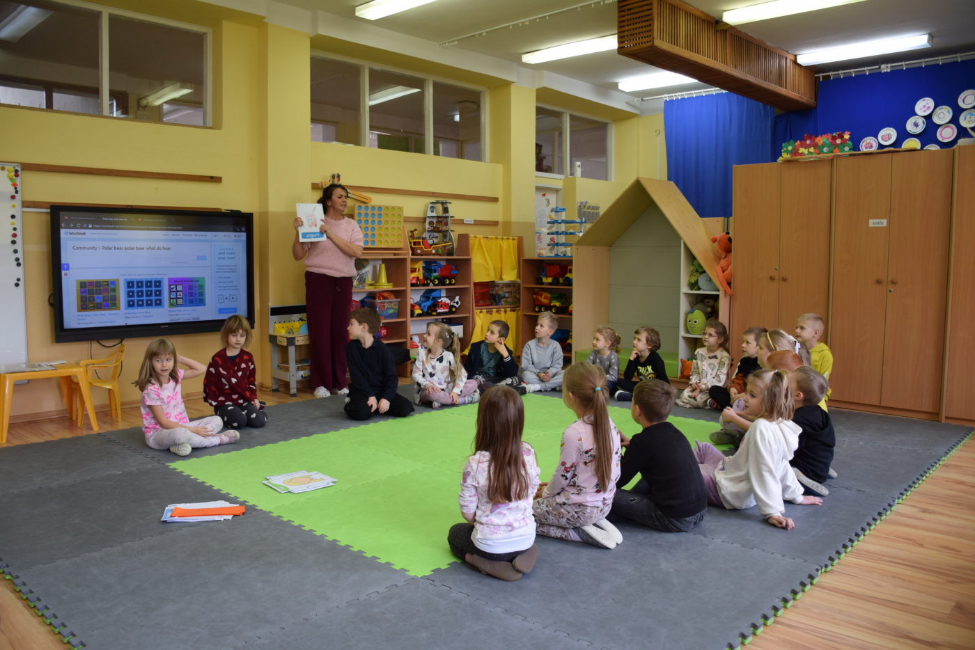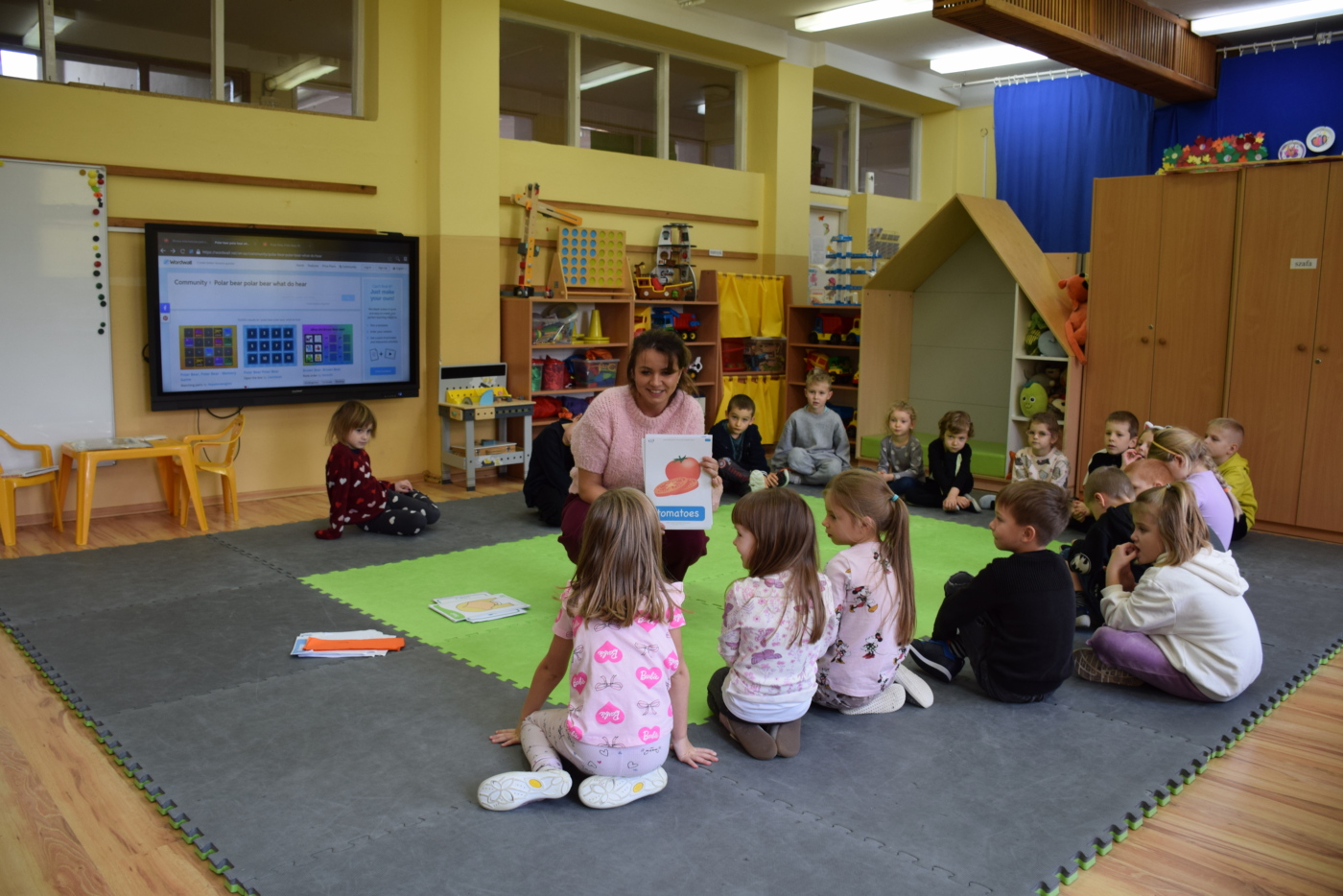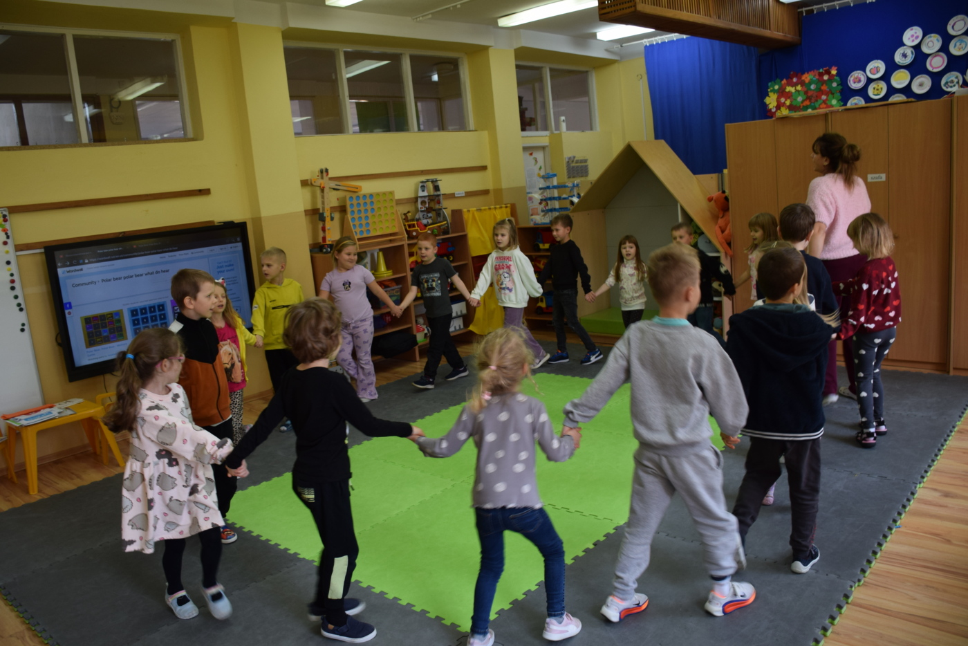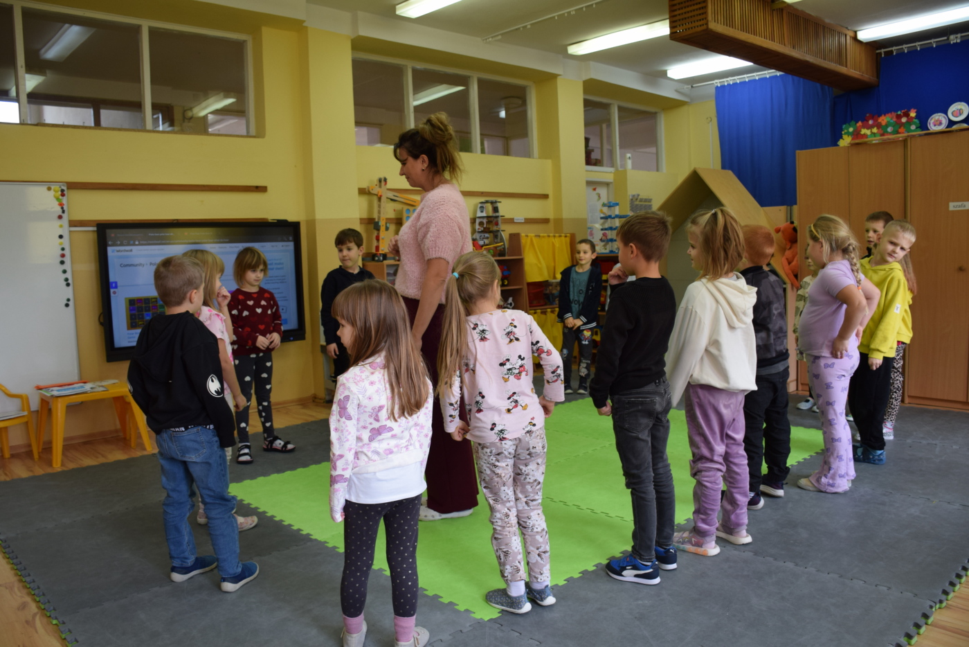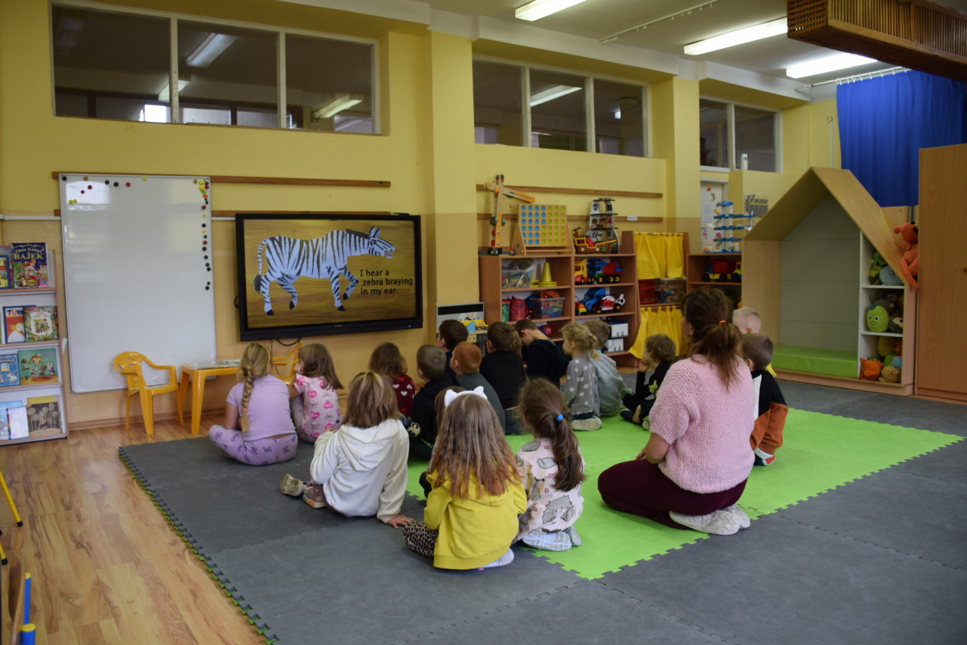 Dzieci były bardzo skupione i zainteresowane, doskonale rozumiały wszystkie polecenia, kierowane do nich wyłącznie w języku angielskim, wykonując każde zadanie z olbrzymim zaangażowaniem i entuzjazmem, a na zajęciach działo się bardzo dużo… Między innymi dzieci chętnie śpiewały znane im piosenki w języku angielskim, recytowały wiersze, utrwalały znane im zwroty, pytania odpowiedzi, słownictwo. Dzieci znają i nazywają kolory, części ciała, słownictwo związane z tematyką jesienną, nazwy zwierząt, potrafiły określić i nazwać nastroje ludzi, pogodę, znają pory roku, miesiące, alfabet. Odczytują globalnie nazwy np. uczuć.