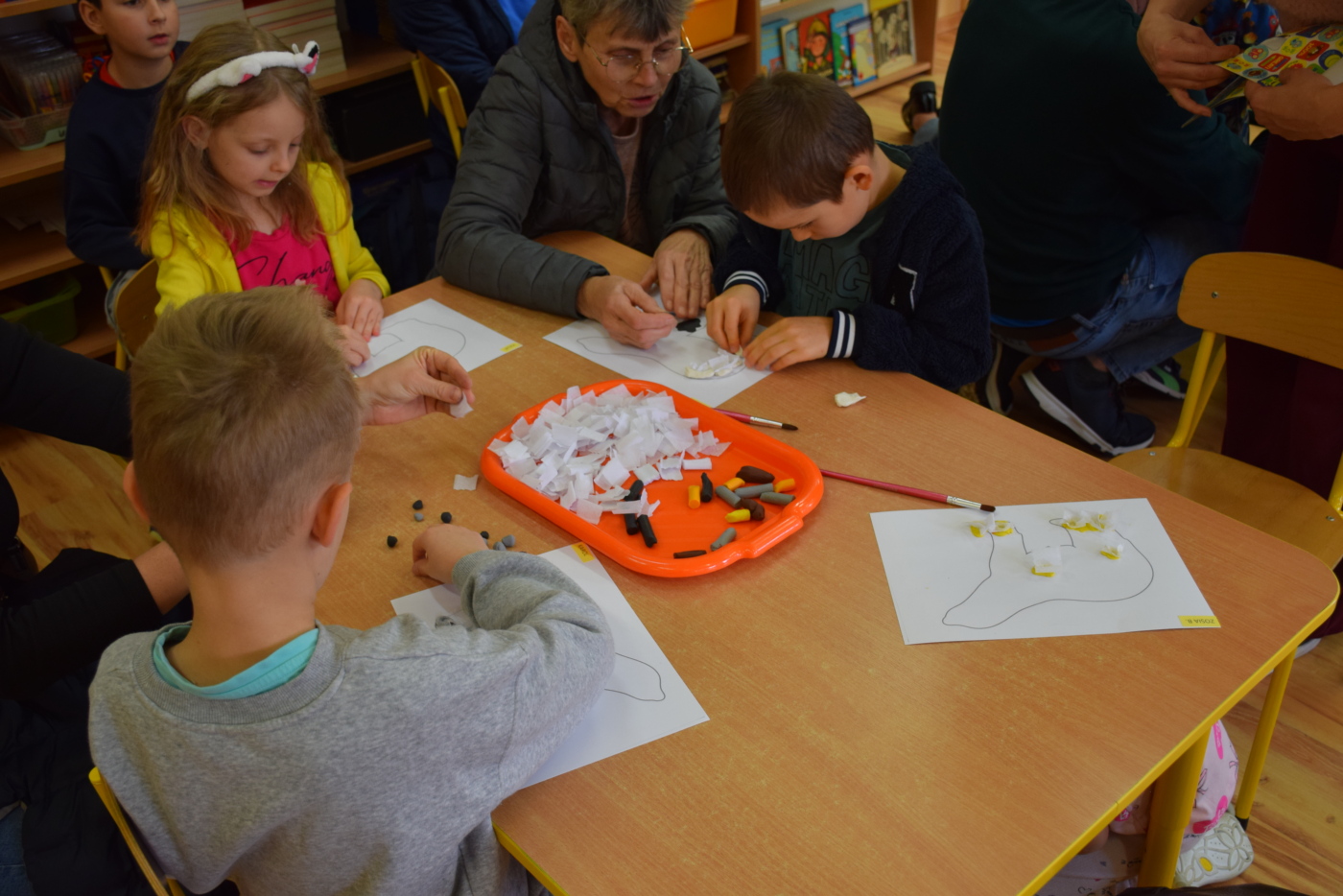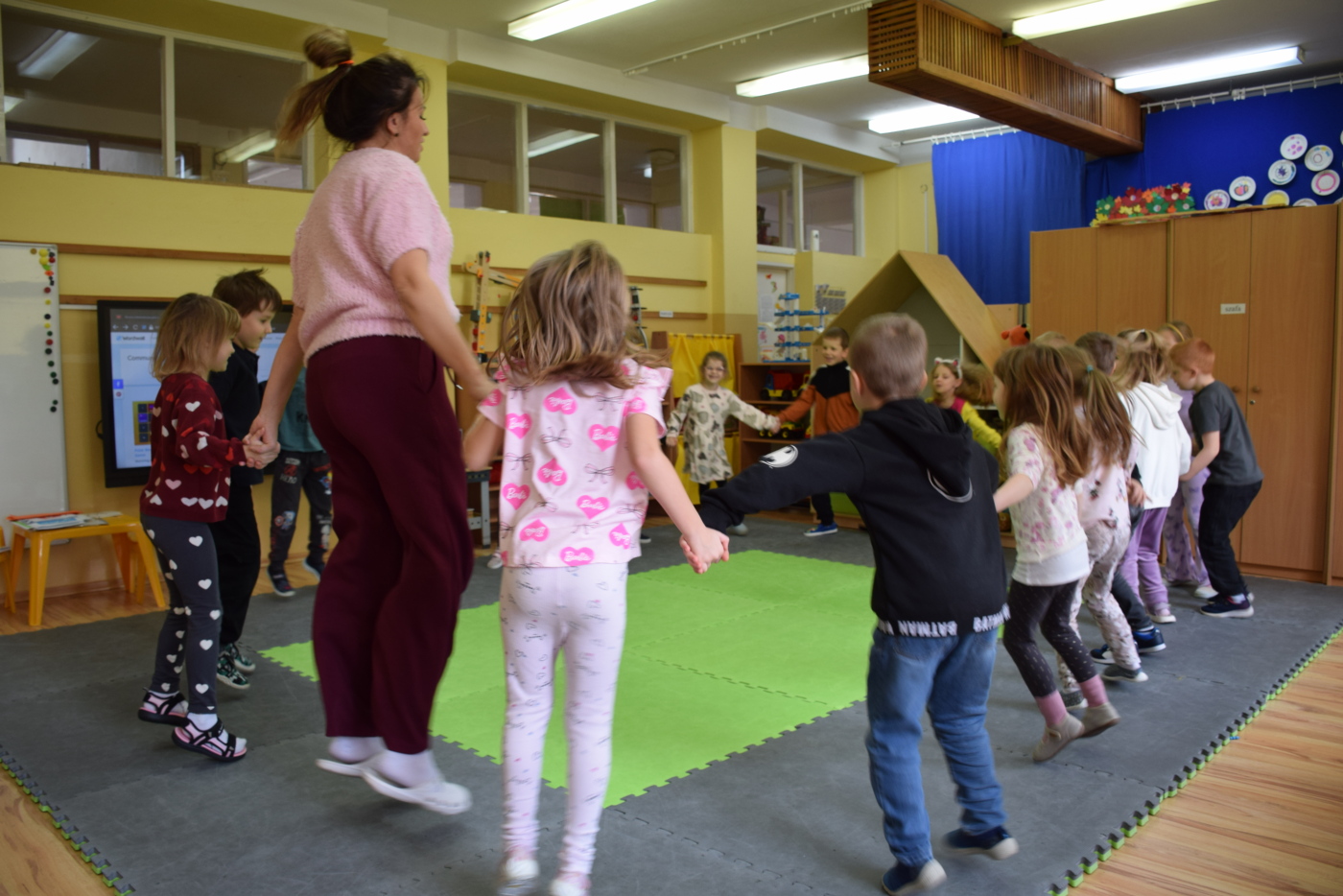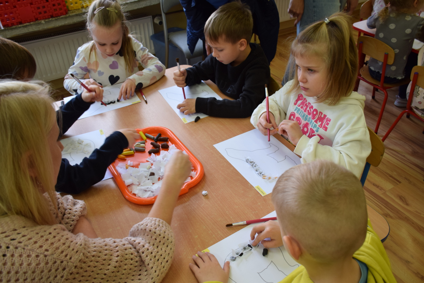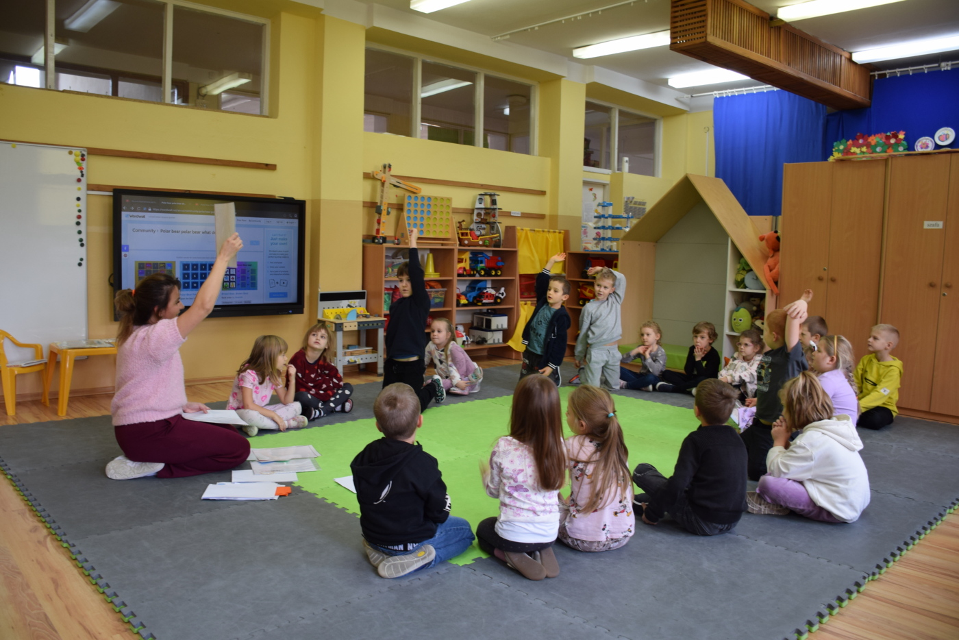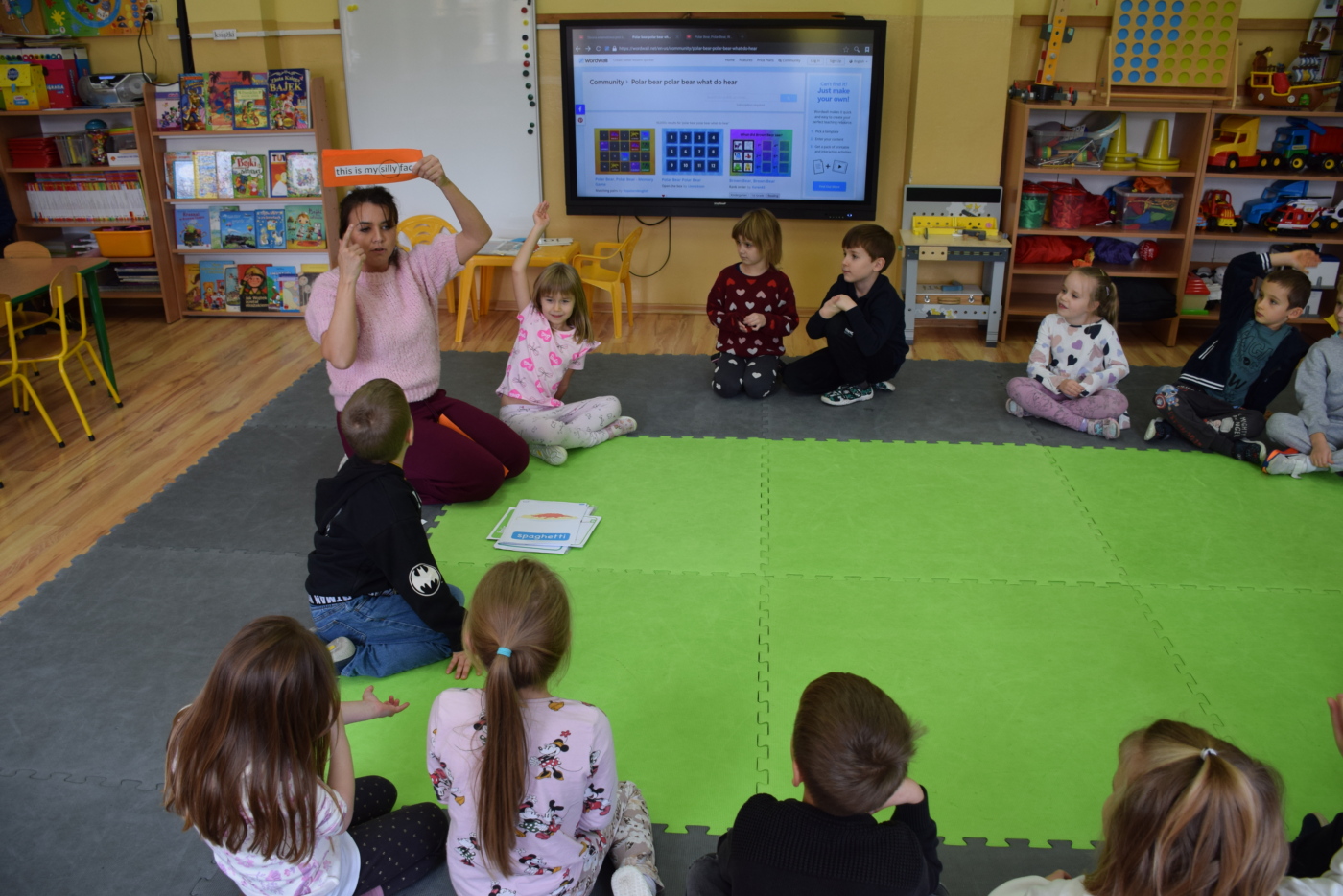 Dzieci były bardzo skupione i zainteresowane, doskonale rozumiały wszystkie polecenia, kierowane do nich wyłącznie w języku angielskim, wykonując każde zadanie z olbrzymim zaangażowaniem i entuzjazmem, a na zajęciach działo się bardzo dużo… Między innymi dzieci chętnie śpiewały znane im piosenki w języku angielskim, recytowały wiersze, utrwalały znane im zwroty, pytania odpowiedzi, słownictwo. Dzieci znają i nazywają kolory, części ciała, słownictwo związane z tematyką jesienną, nazwy zwierząt, potrafiły określić i nazwać nastroje ludzi, pogodę, znają pory roku, miesiące, alfabet. Odczytują globalnie nazwy np. uczuć.